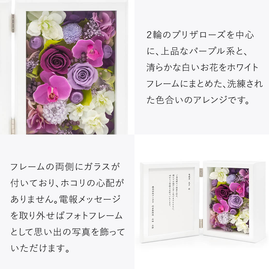 「フォトフレーム レクイエム」は紫のプリザローズを中心に、蘭や菊のアーティフィシャルフラワーを添えた上品で高級感あふれるアレンジ。 両フレームにガラス付きでホコリを防ぎ、美しい状態を長く保ちます。在りし日の姿の写真を飾って、故人をお偲びいただけます。