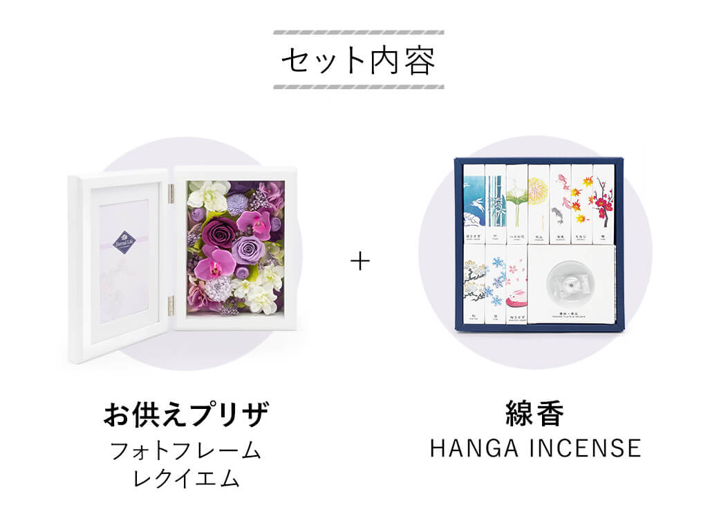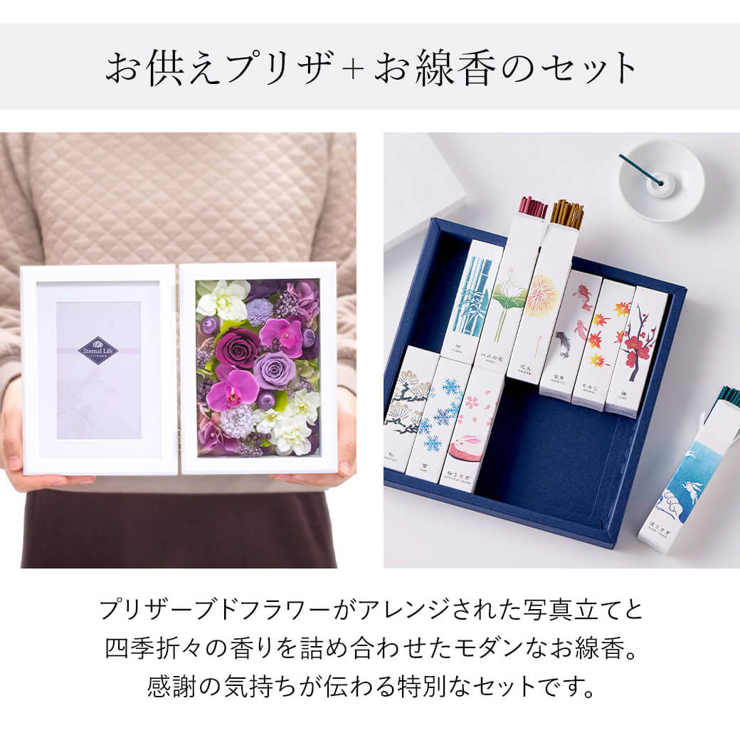 プリザーブドフラワーがアレンジされた写真立て「フォトフレーム レクイエム」と、四季折々の香りを詰め合わせたモダンなお線香「HANGA INCENSE 詰め合わせ」の、感謝の想いが伝わるセットです。