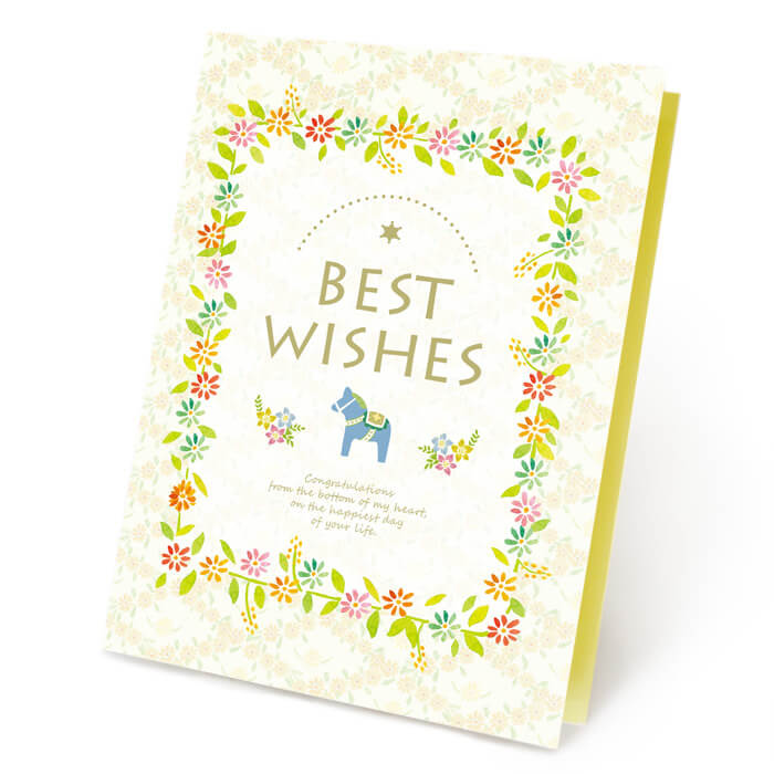 彩り豊かな花のリースが明るく楽しげな印象のデザインです。中央に描かれたダーラナホースは北欧では「幸せを運ぶ馬」と呼ばれており、“BEST WISHES”の言葉とともに、幸せに満ちた前途への祈念や祝福の気持ちを運んでくれます。