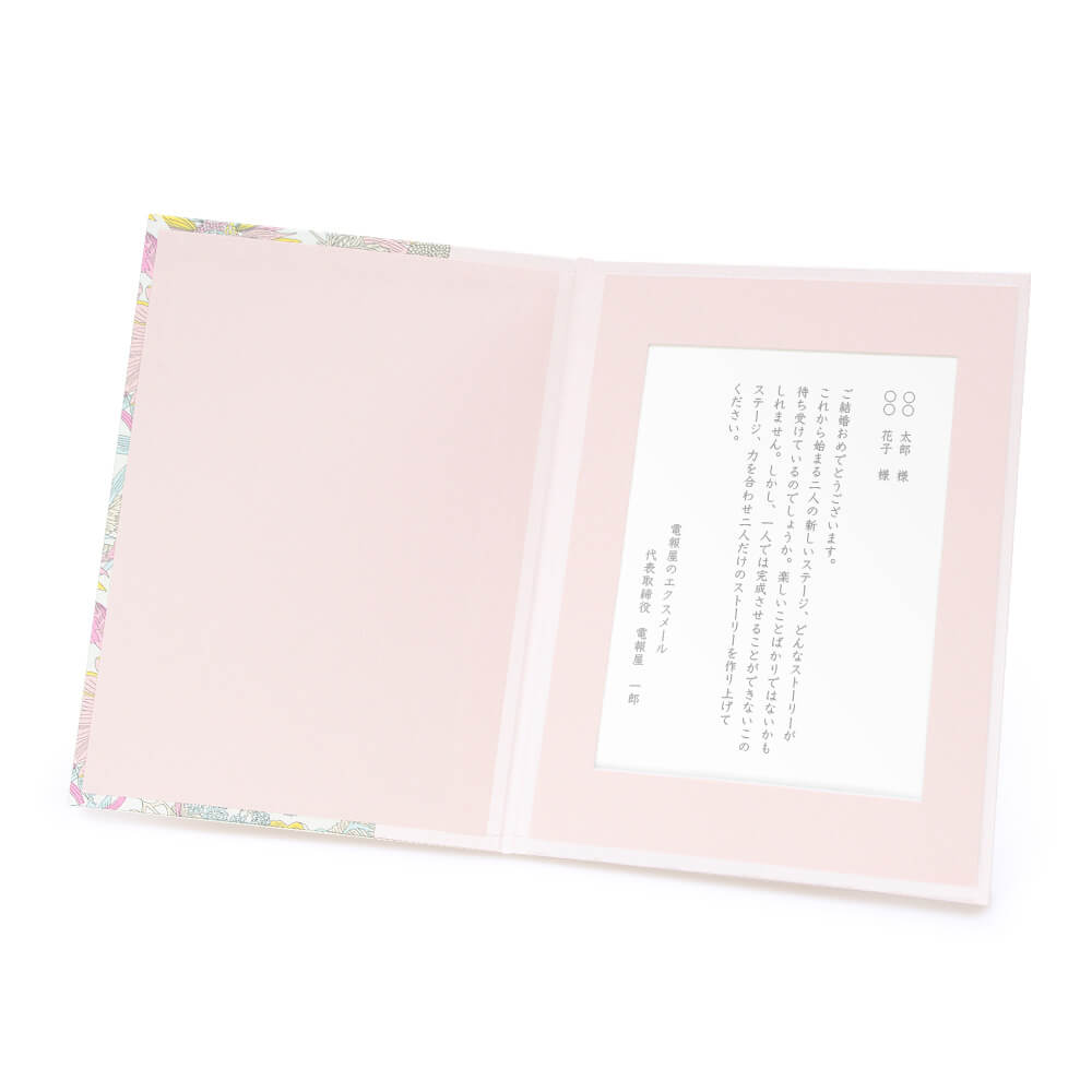 布地部分にパールのような光沢があり、華やかで高級感があります。柔らかく優美な雰囲気のカードで、女性の方や結婚式に贈る祝電としてピッタリです。フォトフレームとしても末永く愛用いただけます。
