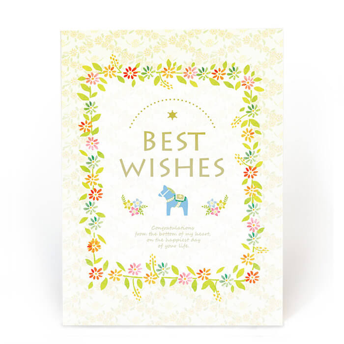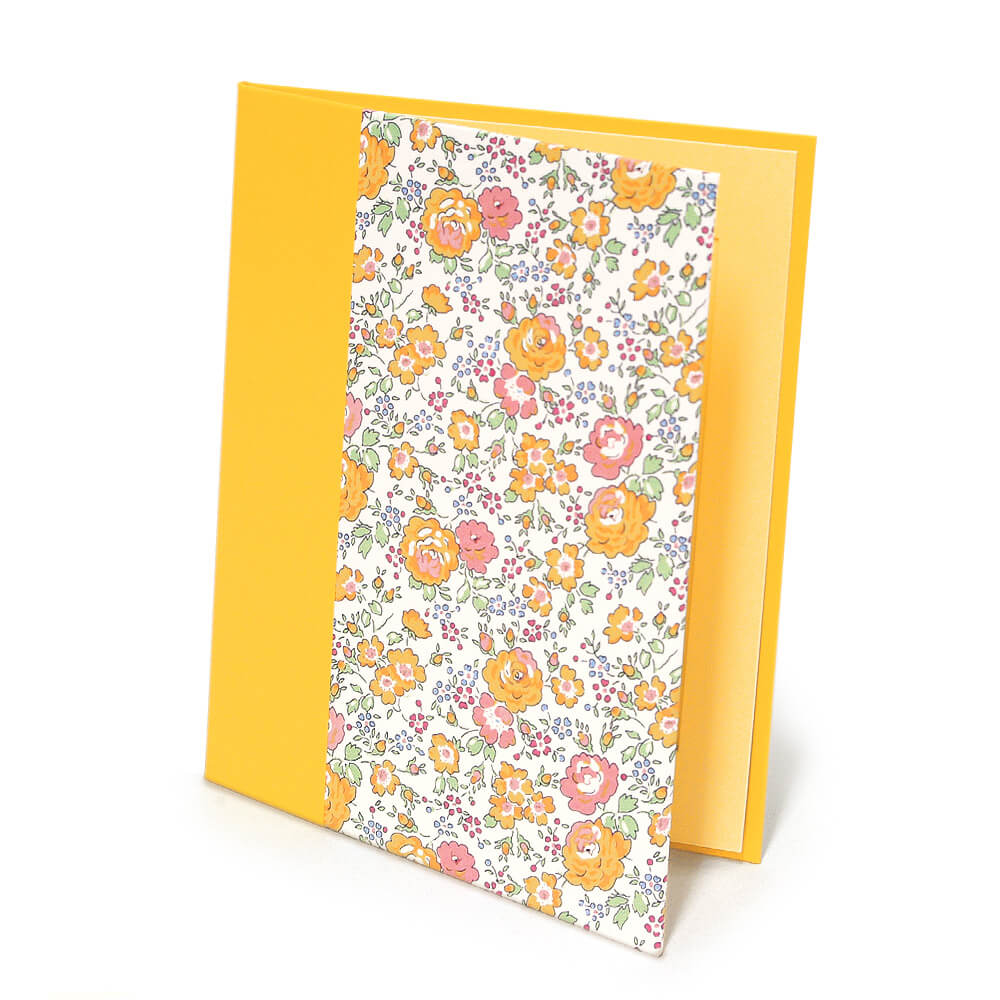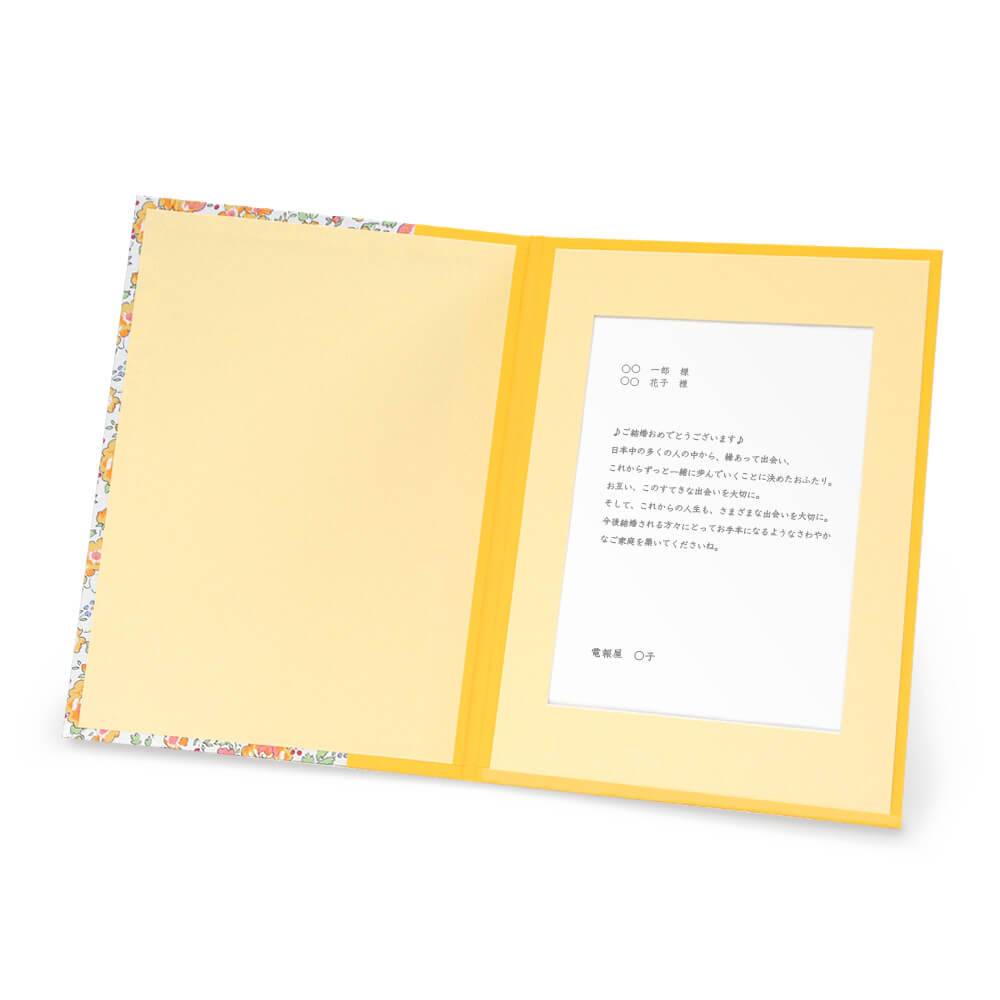 布地は派手過ぎない素朴な印象のたんぽぽ色で、革のようになめらかな手触り。柄名の「フェリシテ(Félicité)」とはフランス語で「最高の幸せ」という意味で、結婚式や誕生日の祝電など、最高の一日をお祝いするのにピッタリの電報です。フォトフレームとしても末永く愛用いただけます。