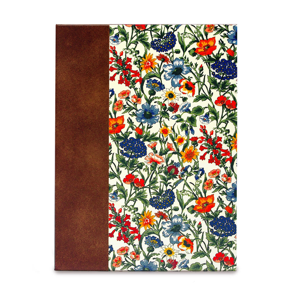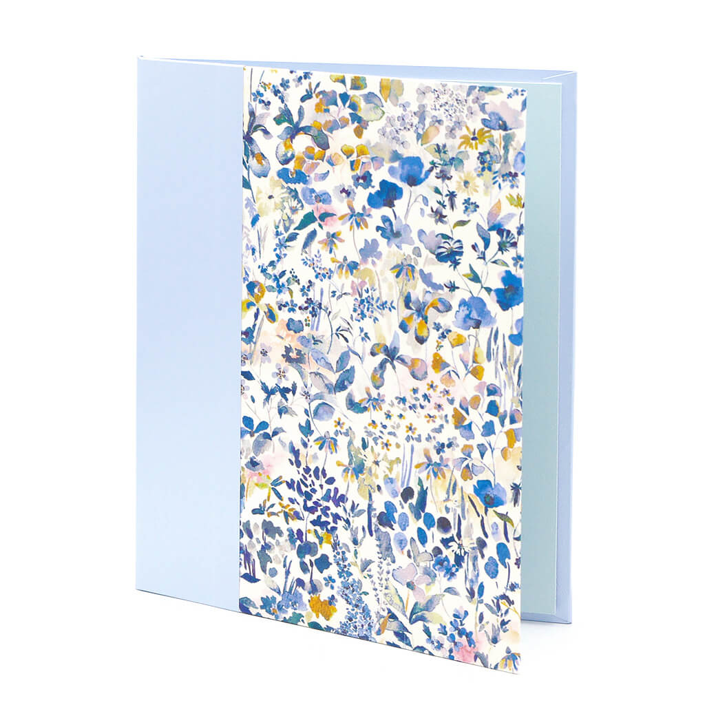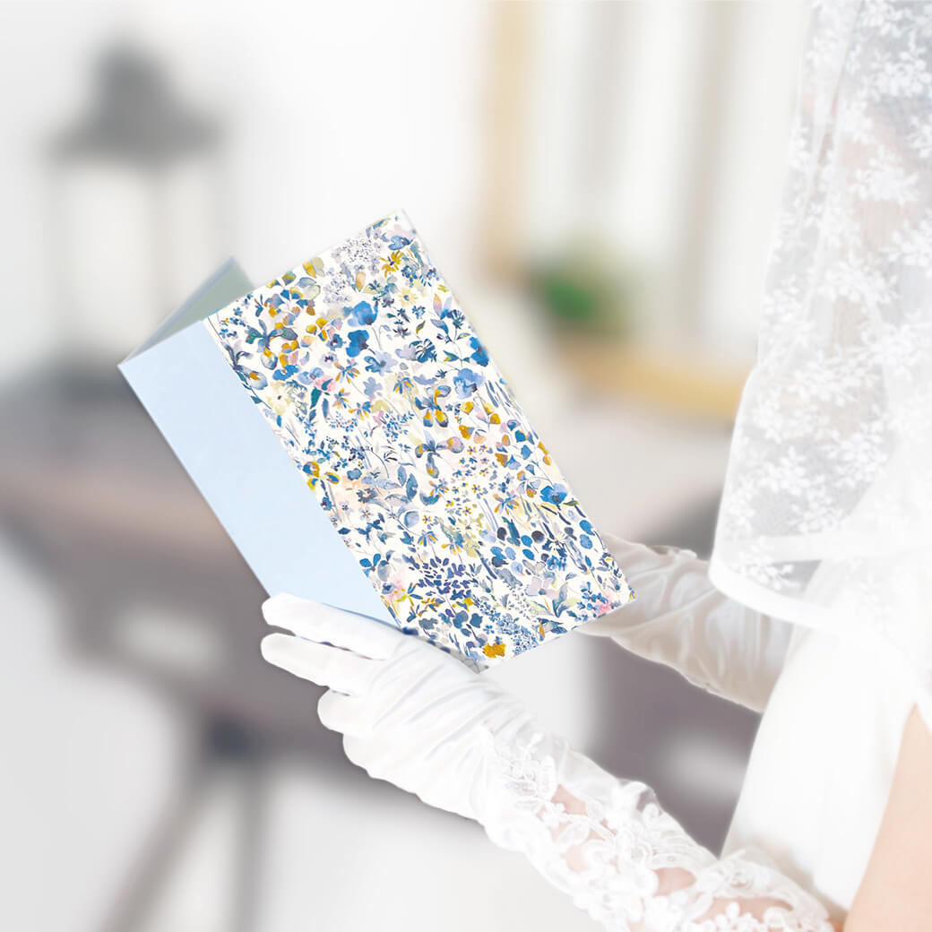 アヤメ、ポピー、デイジーなどの草原に咲く様々な花を描いたデザインです。繊細な水彩で描かれた「フェルダ」はソフトでロマンティックな雰囲気です。上品な輝きのライトブルーの布地は高級感があり、大人の女性や男性へのお祝い電報、「サムシングブルー」として結婚式の祝電にもオススメです。フォトフレームとしても末永く愛用いただけます。