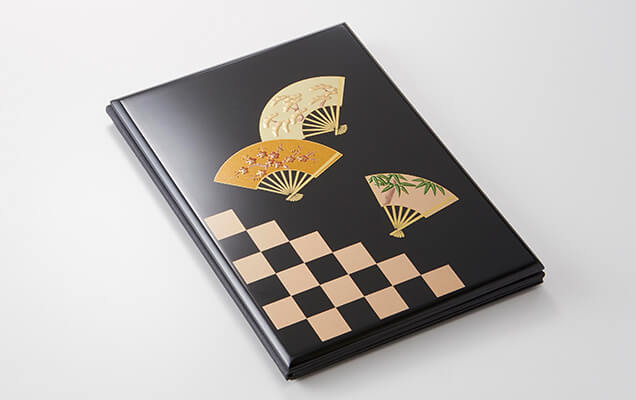 縁起物である松竹梅を描いた扇に、市松柄をあしらい、和の伝統美にモダンな印象を加えています