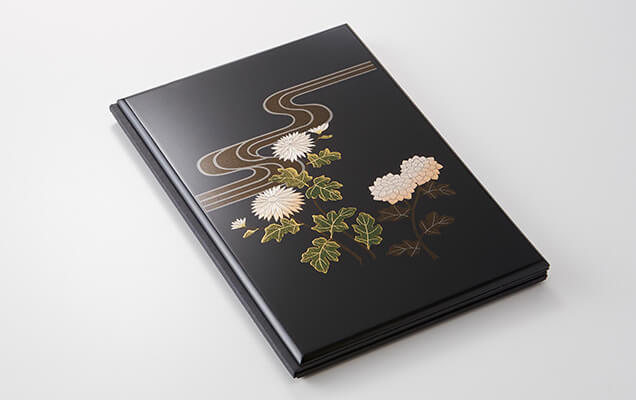 繊細な蒔絵風の細工を施し、艶やかな漆器の風合いを再現した、豪華な台紙です