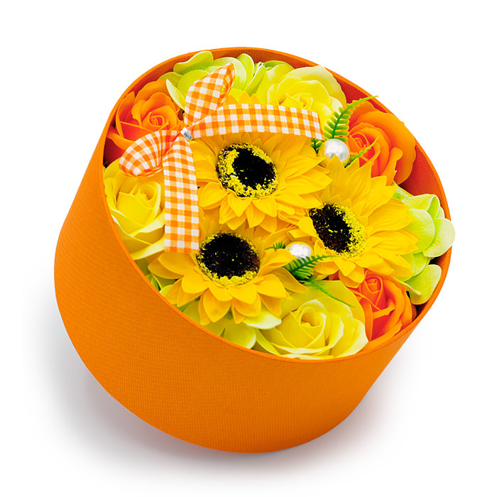 丸いオレンジの箱にヒマワリとビタミンカラーのバラ