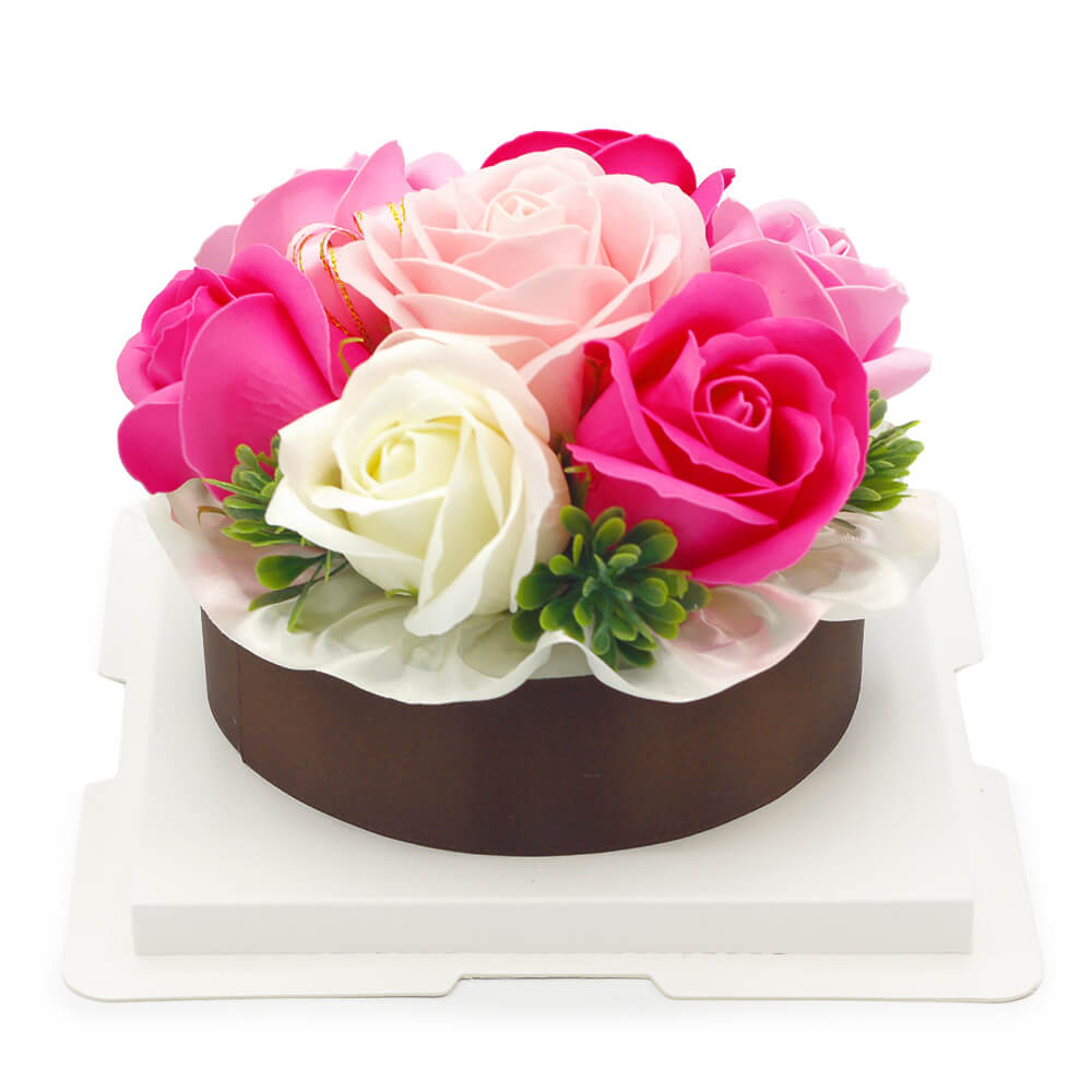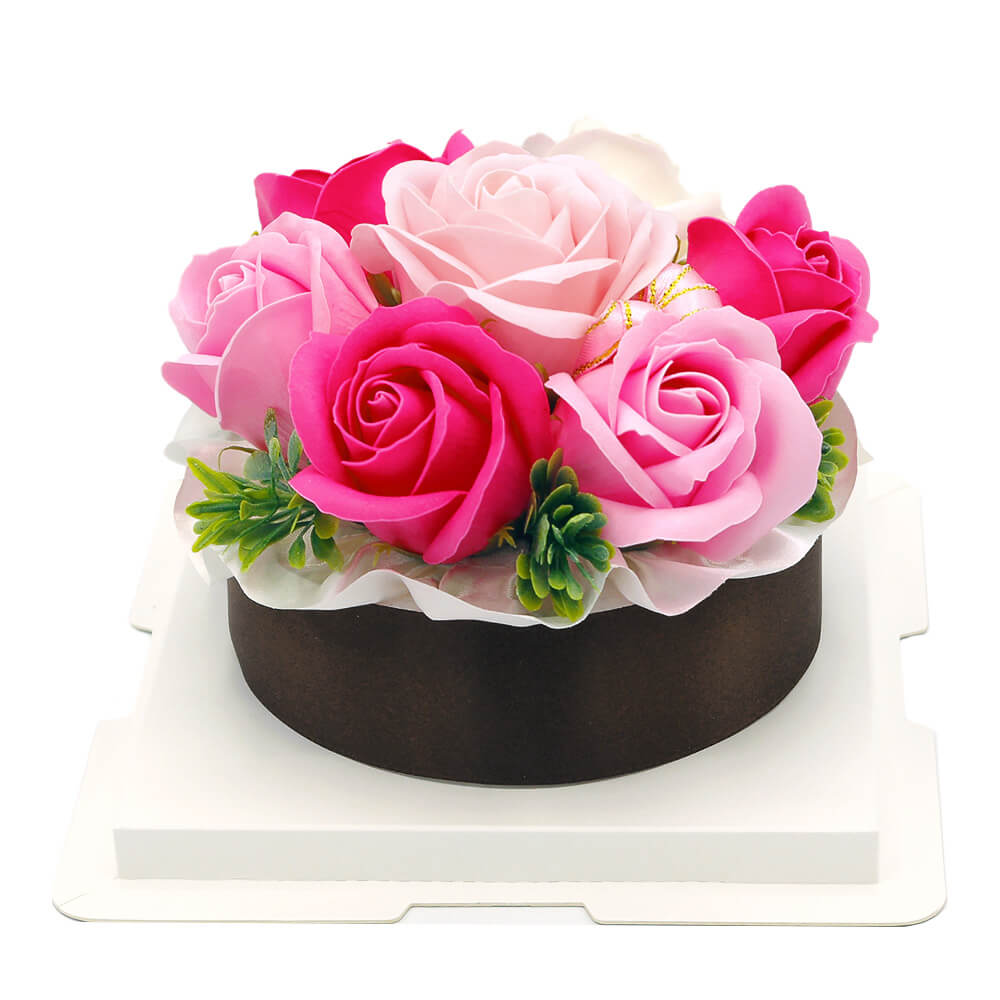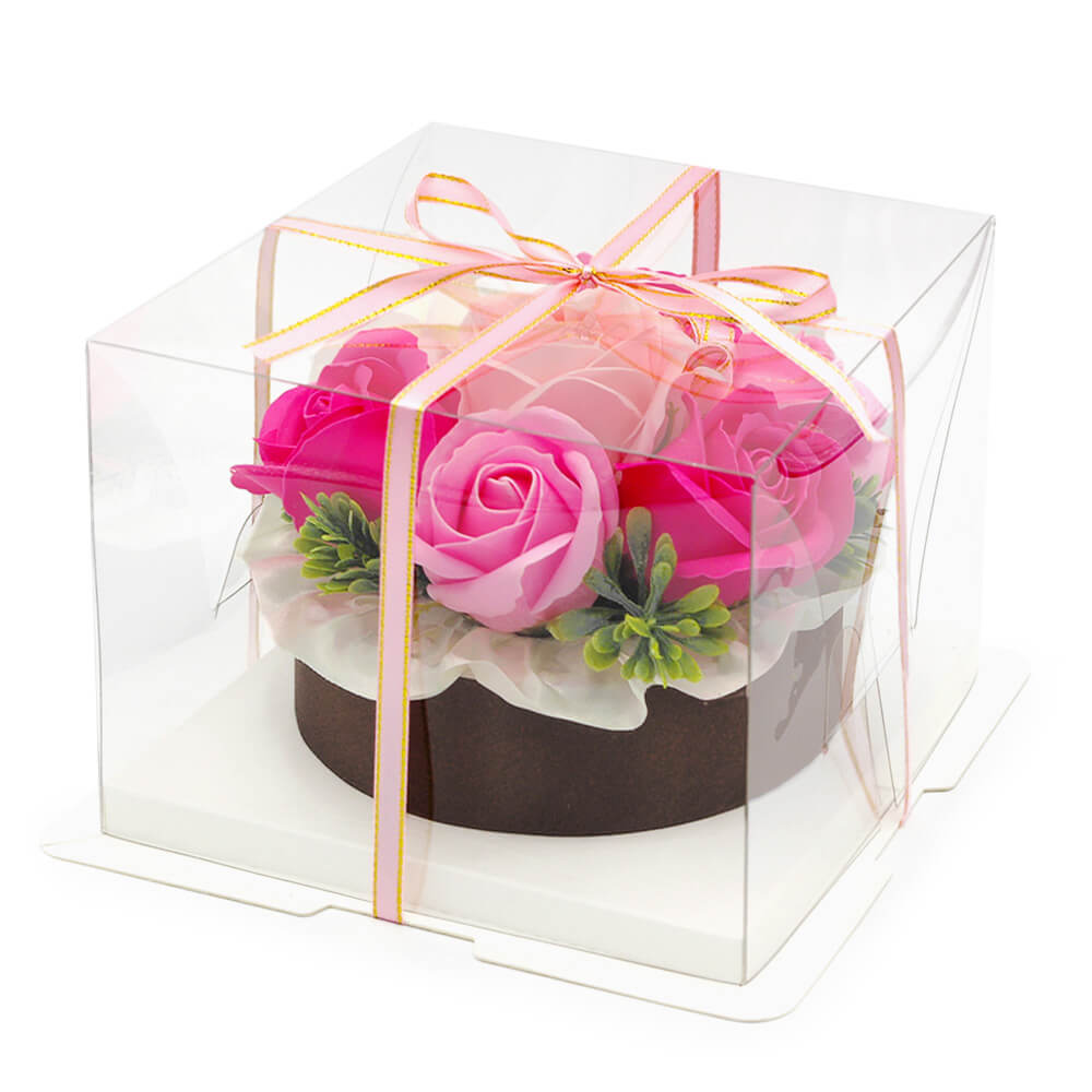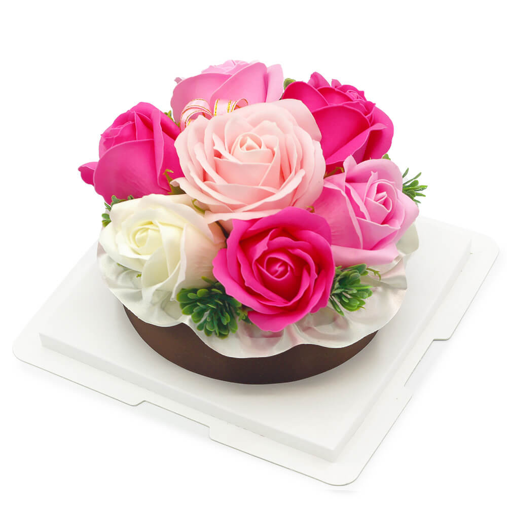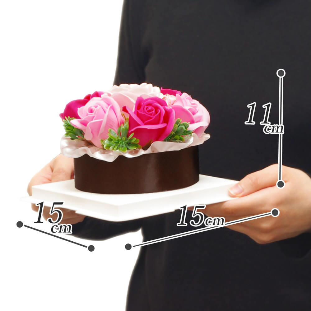 本物のお花のような美しさと上品な香りが魅力のフレグランスソープフラワーを、ケーキのように飾りつけしたスイートでかわいいアレンジです。ピンク系でまとめたバラやカーネーションは幸福感や愛情を感じさせ、お部屋の雰囲気を明るくしてくれます。クリームみたいなフリルやきらきら光るリボンが上品なアクセントに。おしゃれなリボンのついたクリアケースに入っており、そのまま飾ることができるので贈り物に最適です。