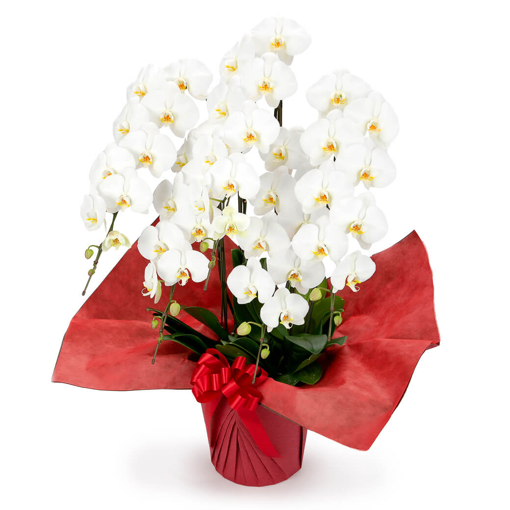 胡蝶蘭の花言葉は「幸福が飛んでくる」。上品で清潔感のある色合いの白い大輪の花は、数週間から数ヶ月も長持ちするため、縁起物として重宝されます。存在感のある5本立の胡蝶蘭は、大切な方へのお祝いのギフト、開業祝い・開店祝いや取引先・得意先の就任・昇進などの慶弔関係の贈り物として、広く支持されています。