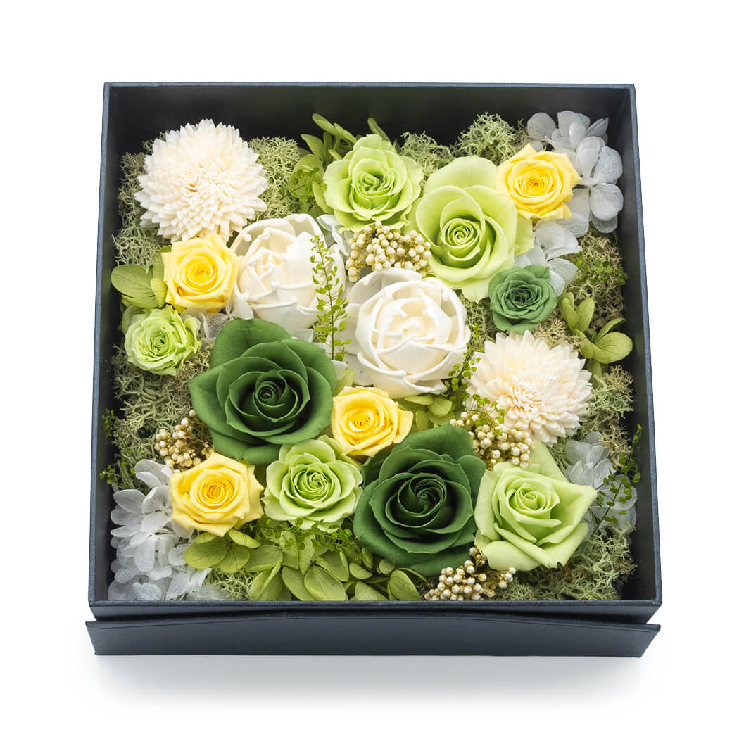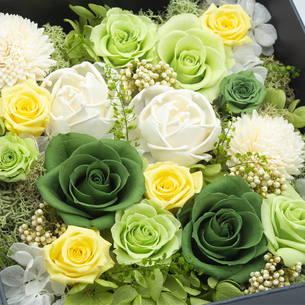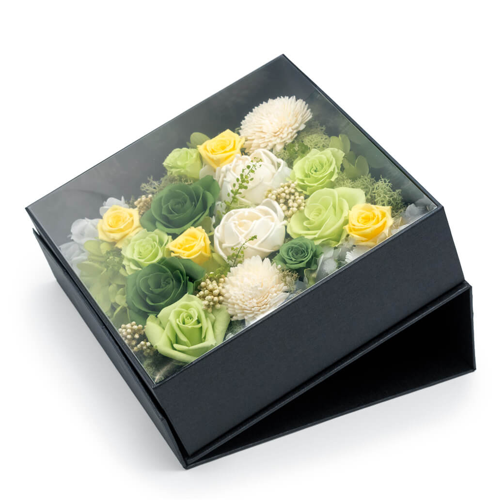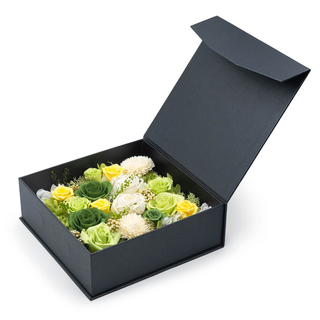アレンジには濃淡のある緑色と、淡黄のバラをふんだんに使用。白いソラフラワーやアーティフィシャルグリーンのアクセントが、自然の温もりと格調高さを感じさせます。静かに開く蓋は、マグネットでしっかりと閉じられる仕様。開いた状態では、花が斜めに見えるよう設計されており、美しい表情を最適な角度でお楽しみいただけます。前面にはクリアカバー付きで、ホコリや汚れの心配もありません。水やり不要のプリザーブドフラワーは、枯れずに美しさを保つ“永遠の花”。ご葬儀などのお悔やみ事のお供えに、法要・命日・お盆・お彼岸の贈り物としてお選びいただいております。