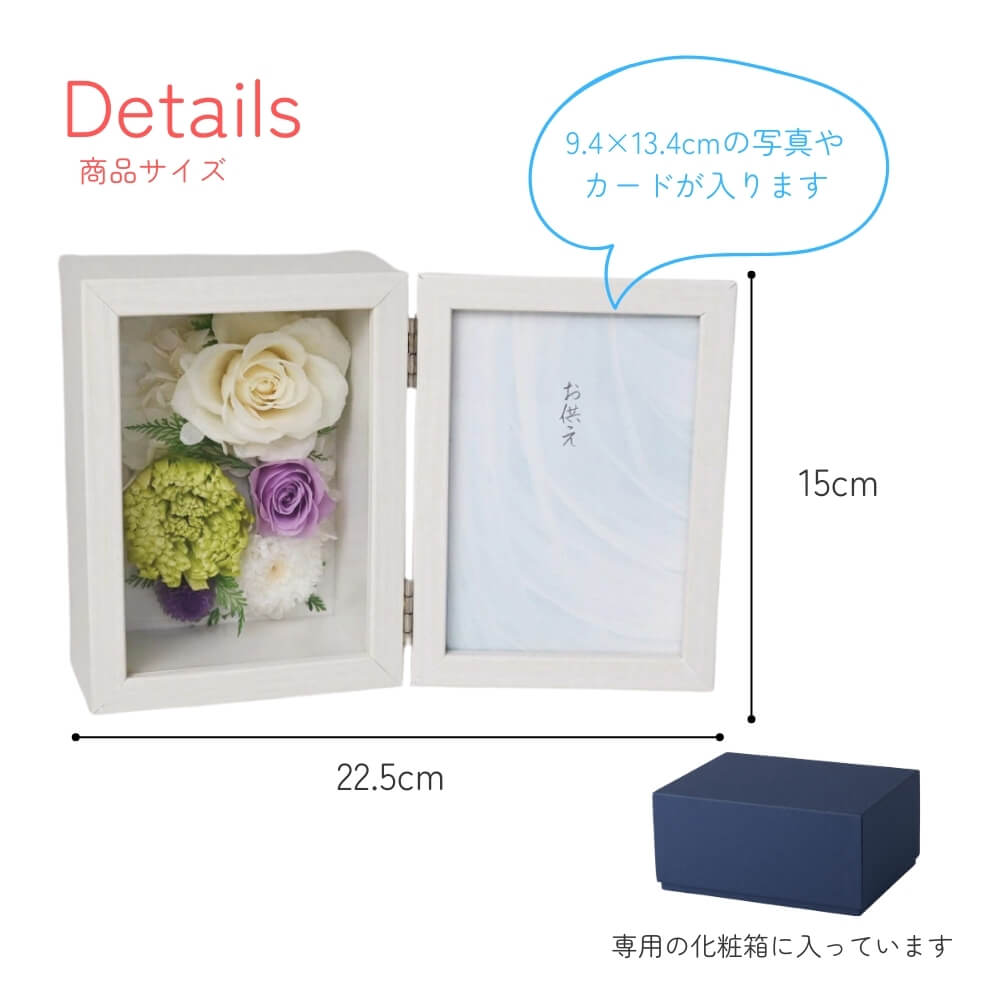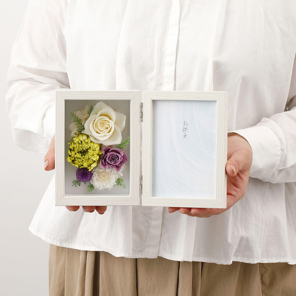 白い木目調のフォトフレームに、メインの白いバラ、黄緑のマムや紫のバラ、白いアスターなどを組み合わせ、上品で清らかな色合いにアレンジしました。両開きのデザインで、左側にお花、右側に写真を飾ることができるため、故人を偲びつつお仏壇やお部屋に穏やかな華やぎを与えてくれます。