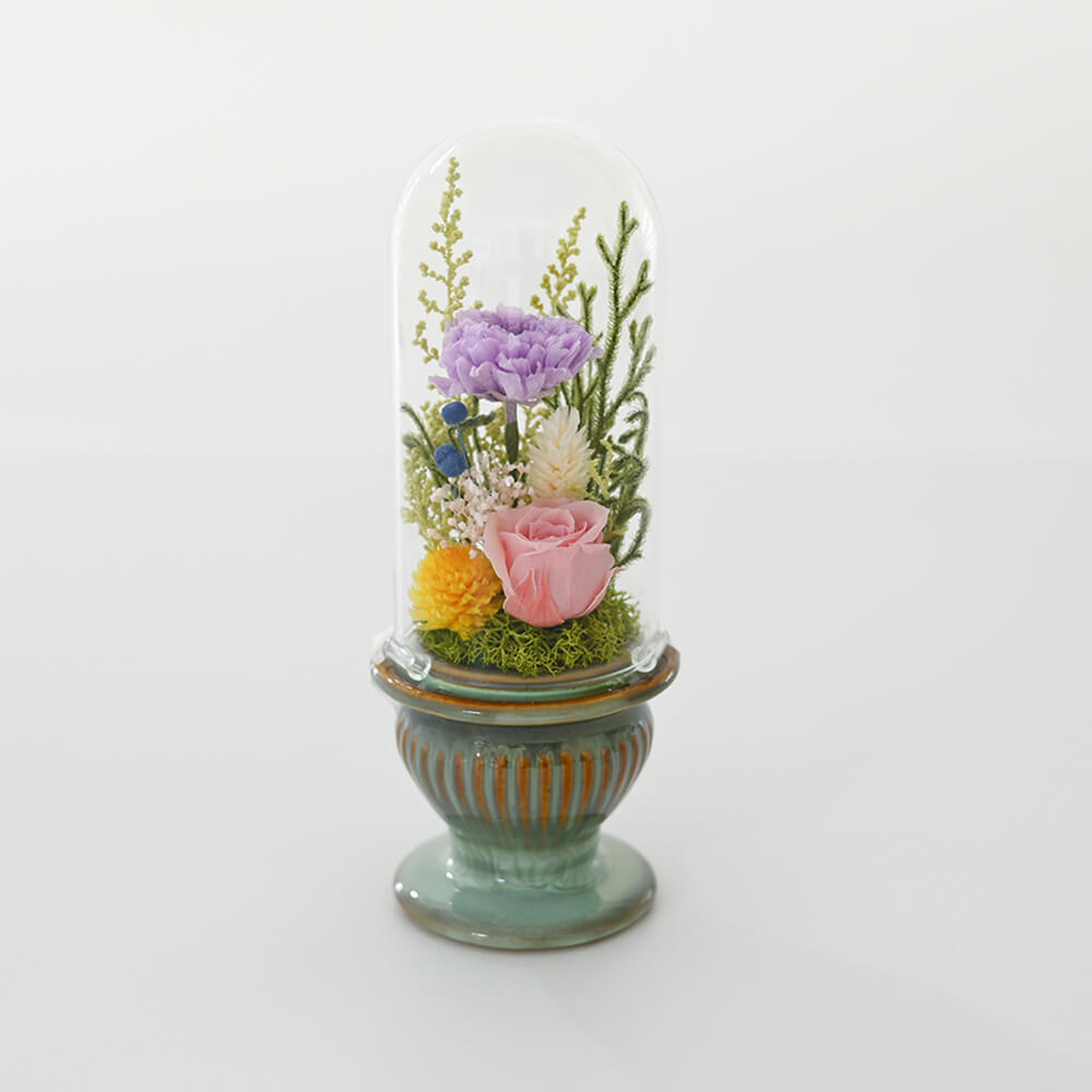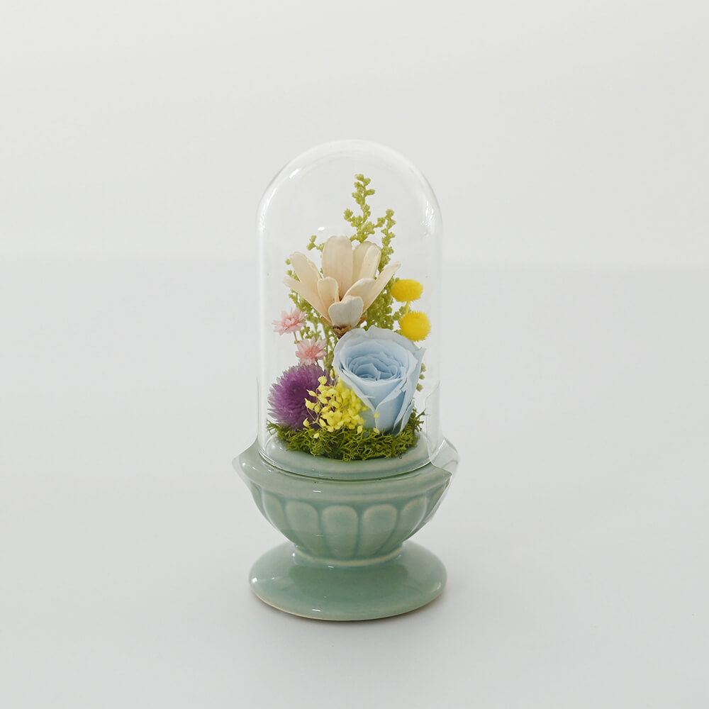 小さなバラや、素朴で温かみのある花々を、ガラスドームの中にアレンジメントした、お供え用のプリザーブドフラワーです。清らかな白と淡い水色を基調に、紫や黄色の花々をあしらった、落ち着いた中にも愛らしさが感じられるアレンジ。