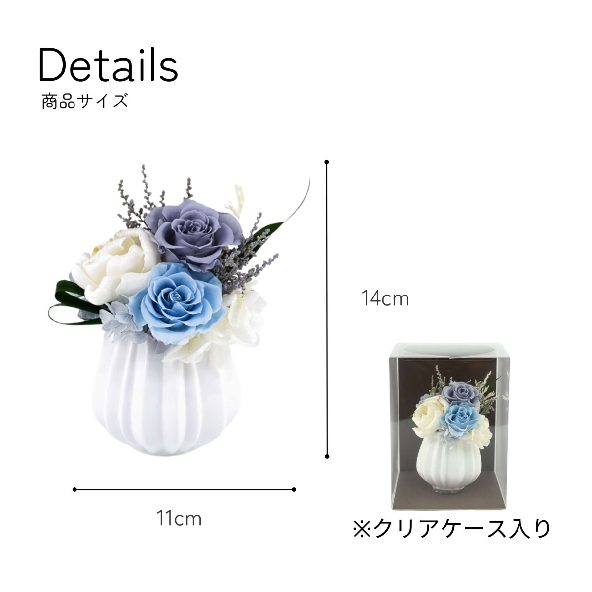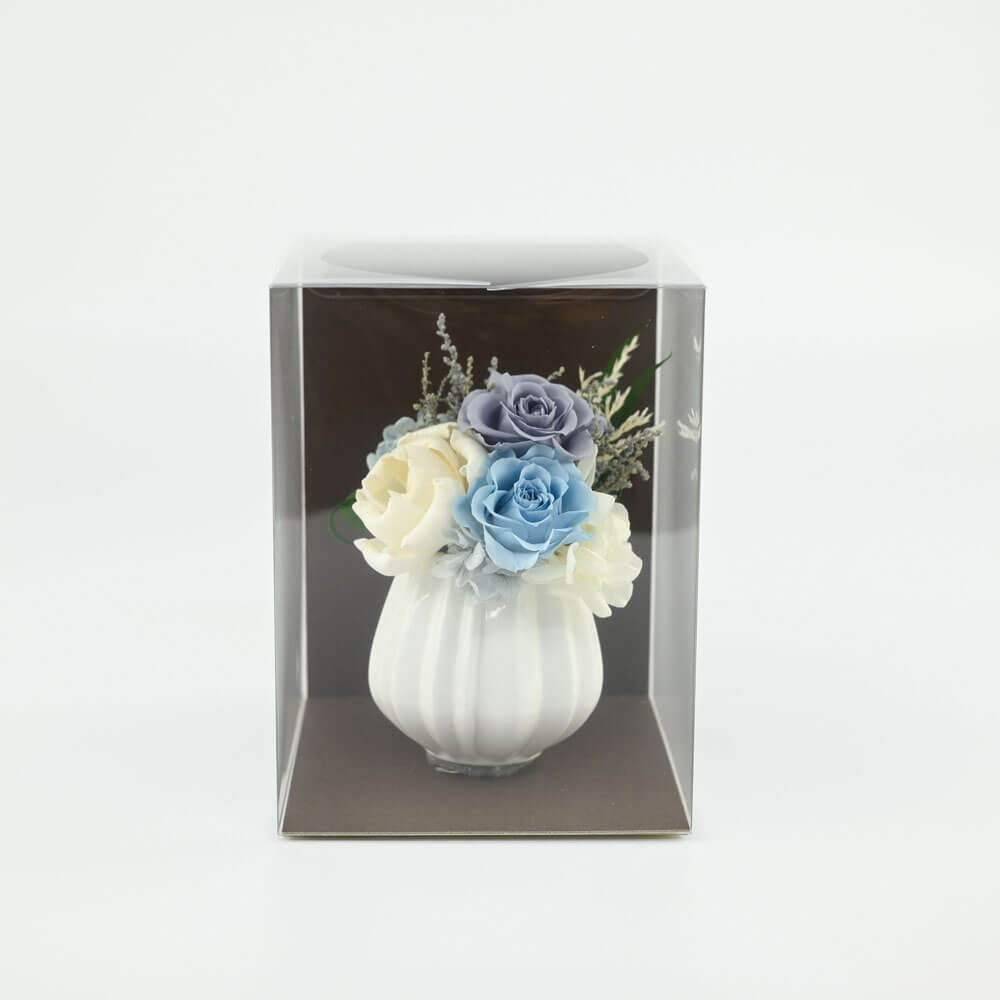 落ち着いた青系の花々が静けさを感じさせる、お供え用のプリザーブドフラワーです。