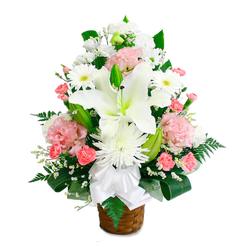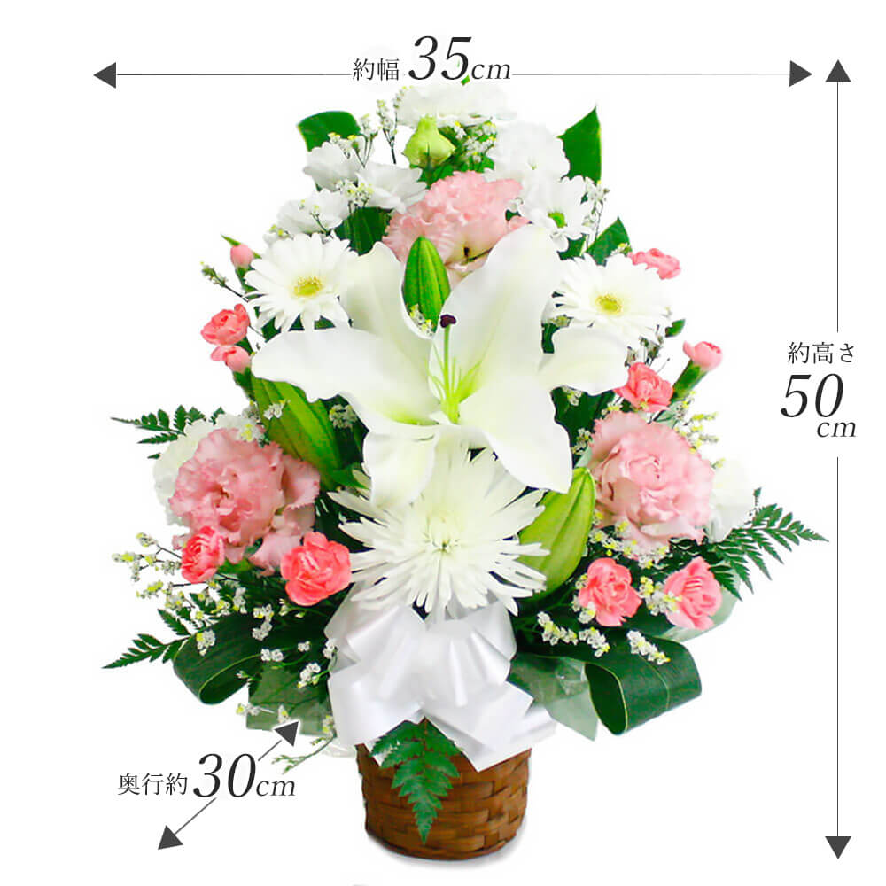 白ユリをメインに淡いピンク系の花をまとめた、優しさや愛情を感じさせるアレンジです。命日や一周忌などの年忌法要、お盆・お彼岸の供花として、女性やお子様へのお供えにおすすめです。バスケットに活けたアレンジメントのお供え花で、花瓶に移し替えるお手間をおかけしません。
