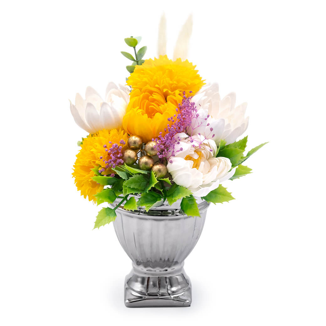 落ち着きのある光沢と丸みを帯びたシルバーのポットが、あたたかみの中にも凛とした印象を添える、上品なお供え用アレンジです。白と黄色の菊の花は、清らかさや静けさ、そして陽だまりのようなやさしさを感じさせ、晴れやかで穏やかな彩りをもたらします。