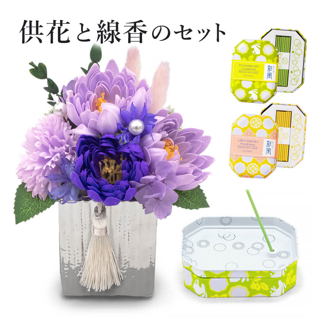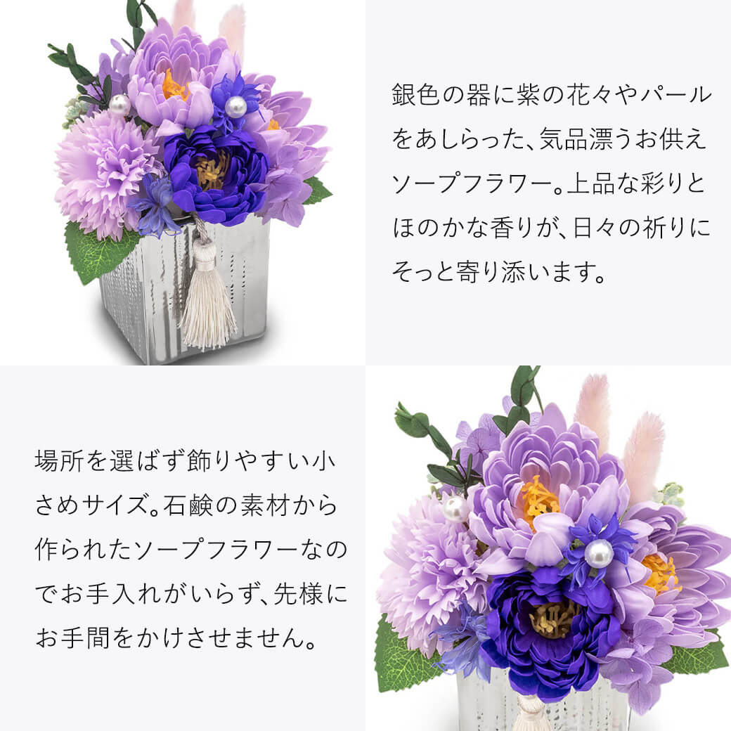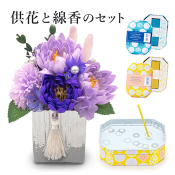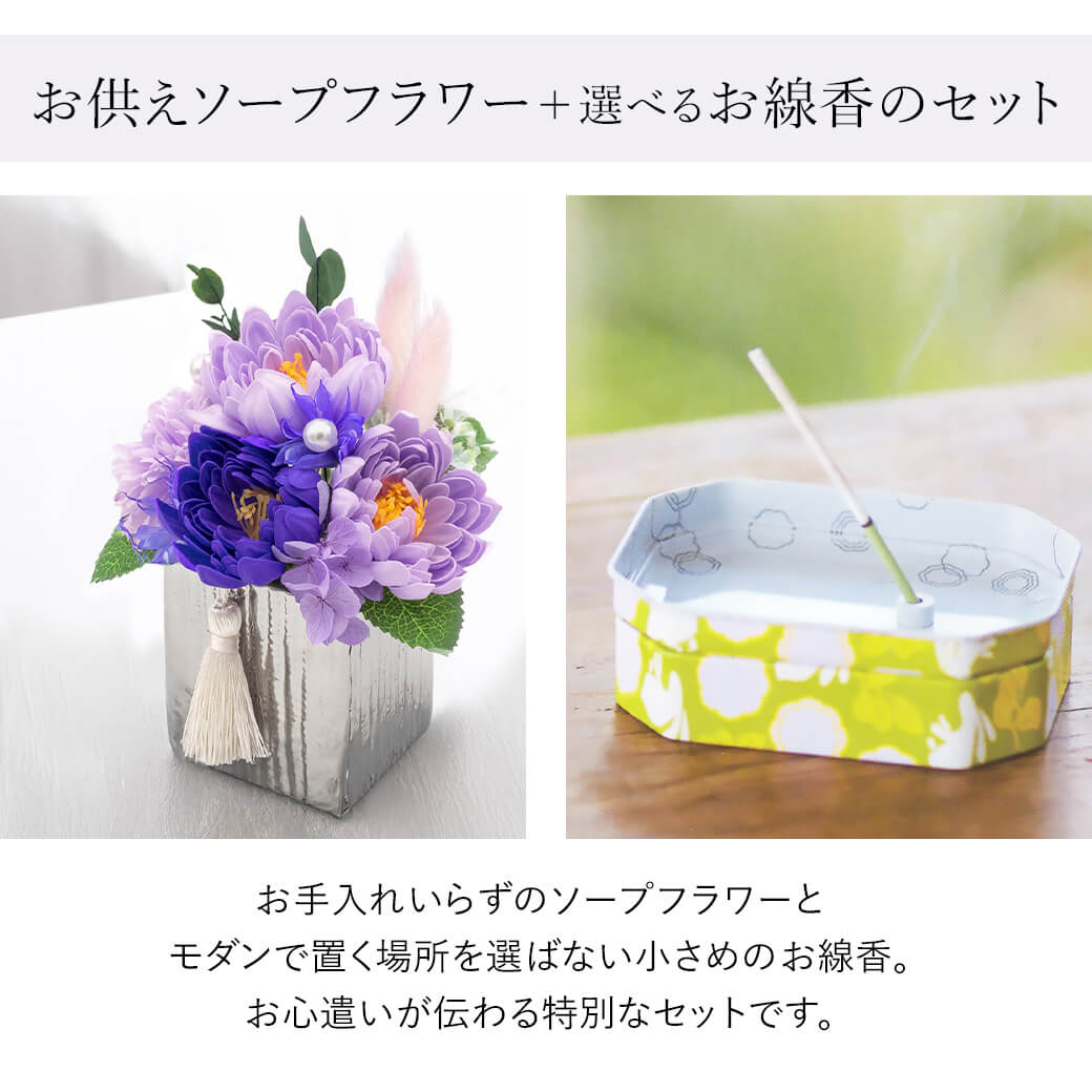 紫の花々やパールをあしらったお供えソープフラワーと、ミニサイズのお線香のセットです。