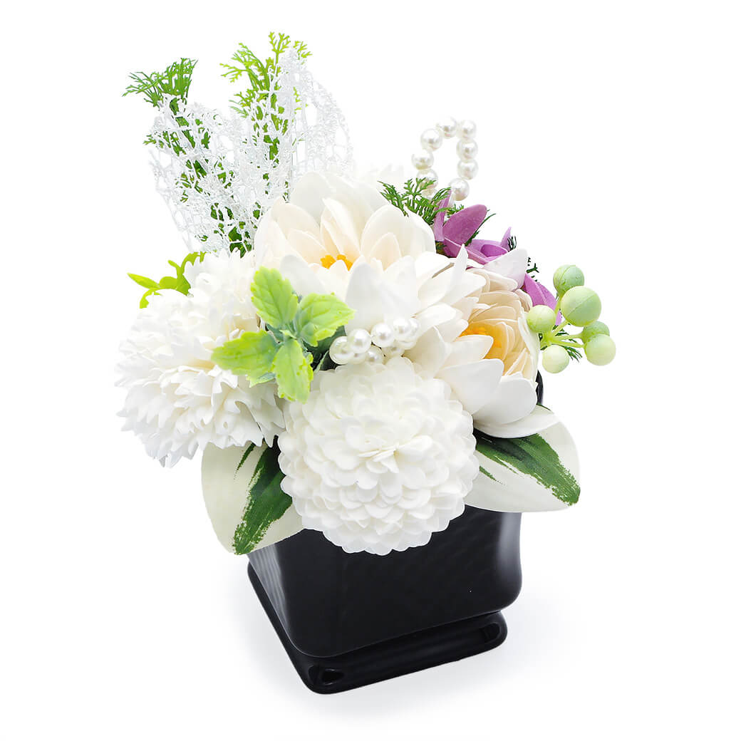 落ち着いた光沢のある黒のダミエポットに、白菊の花をメインにグリーンやパールパーツで上品にまとめた、清らかな雰囲気のお供え用アレンジです。