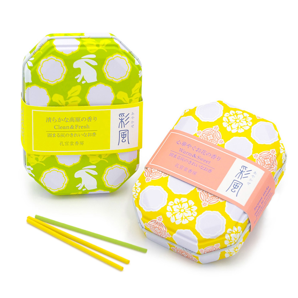 彩風は、自然をテーマに和と洋の薫りを繊細にブレンドしたお香です。色とりどりに咲くお花畑の香り、美しく清らかな高原の香りのセット。フタ裏が香立・香皿となっており、すぐにお使いいただけます。かわいらしいデザインの小箱は使い終わったら小物入れとしてもご利用できます。