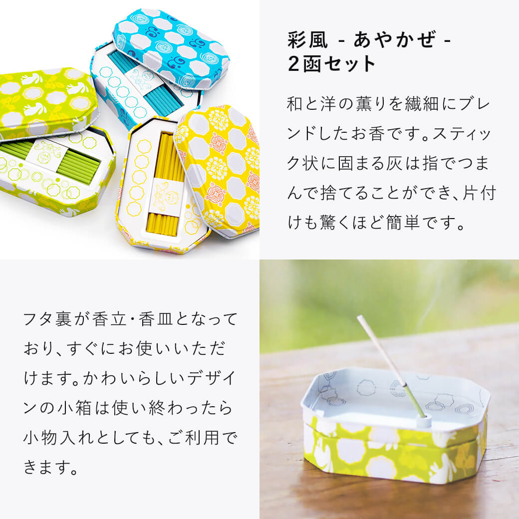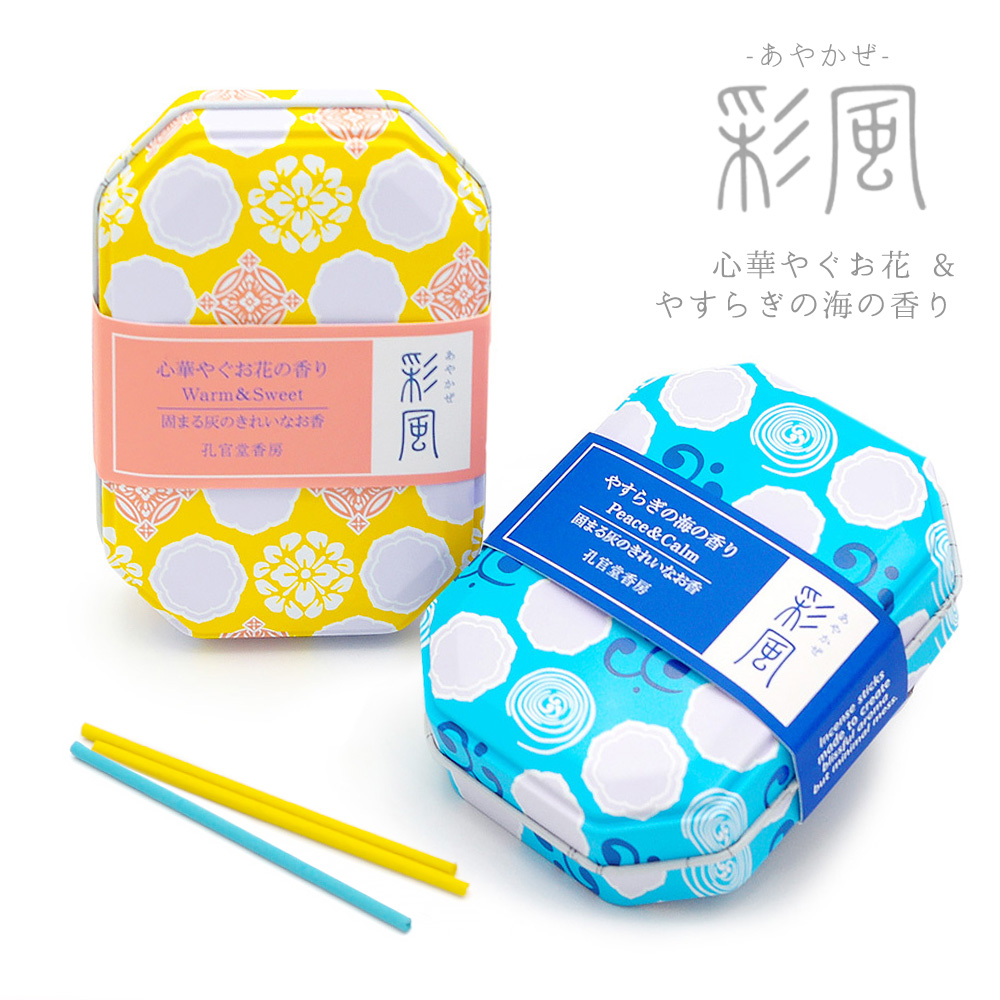 彩風は、自然をテーマに和と洋の薫りを繊細にブレンドしたお香です。色とりどりに咲くお花畑の情景を表現した甘くほっと癒やされる「お花の香り」と、全てを深く包み込む紺碧の海を表現した優しい「海の香り」のセット。フタ裏が香立・香皿となっており、すぐにお使いいただけます。かわいらしいデザインの小箱は使い終わったら小物入れとしてもご利用できます。