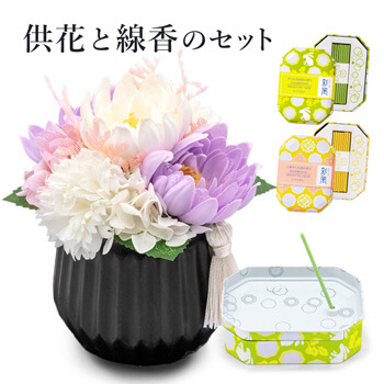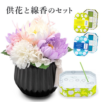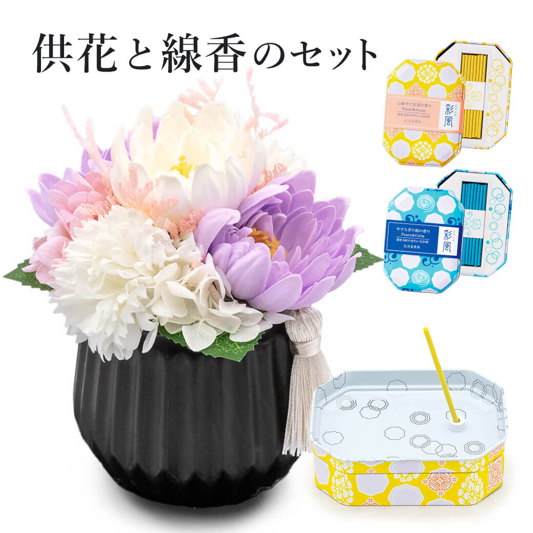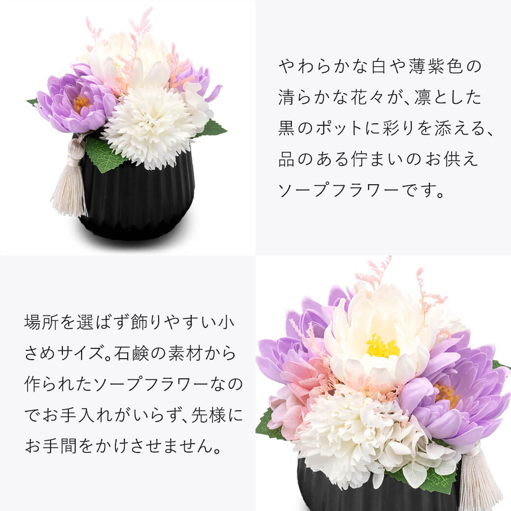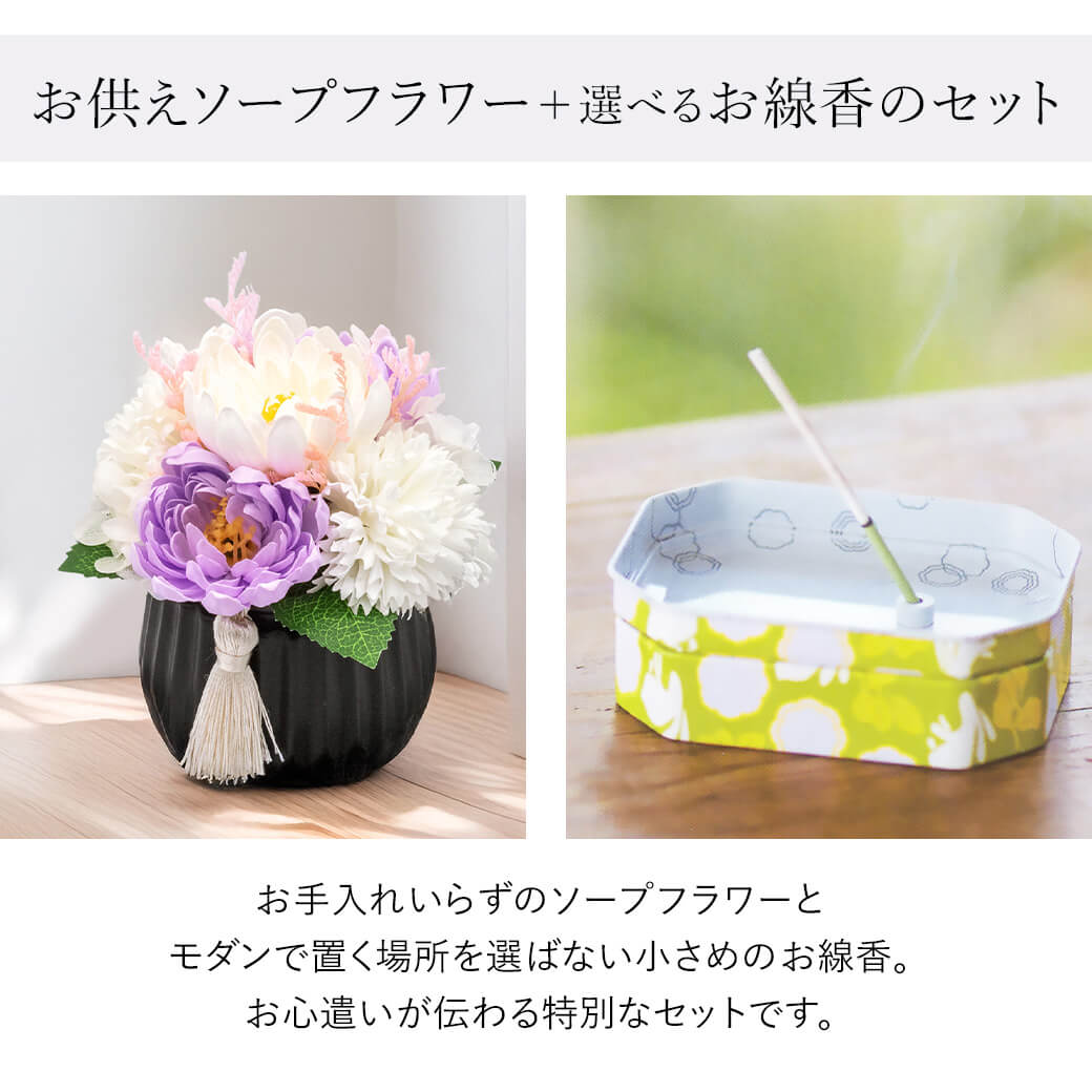 清らかな花々と凛とした黒のポットが上品なお供え用ソープフラワーと、ミニサイズのお線香のセットです。