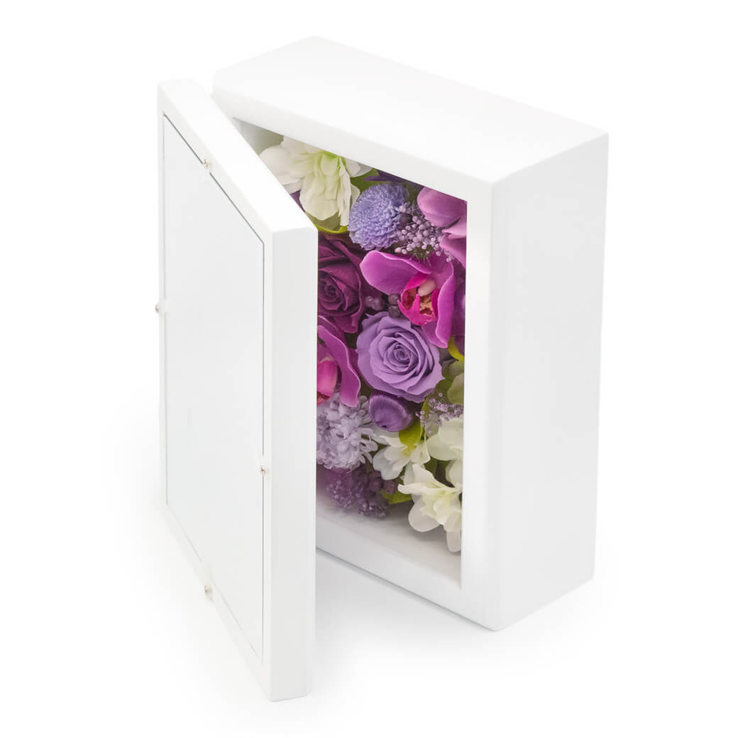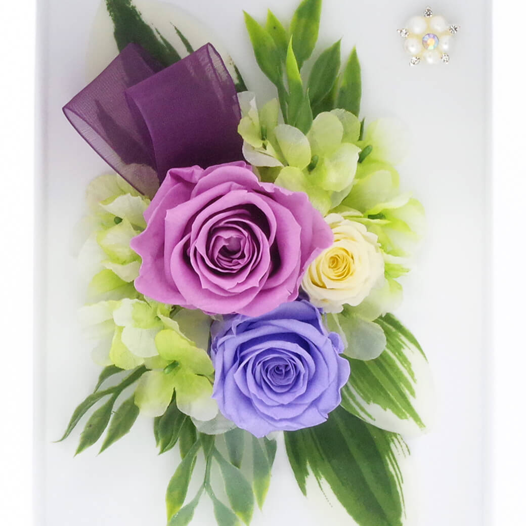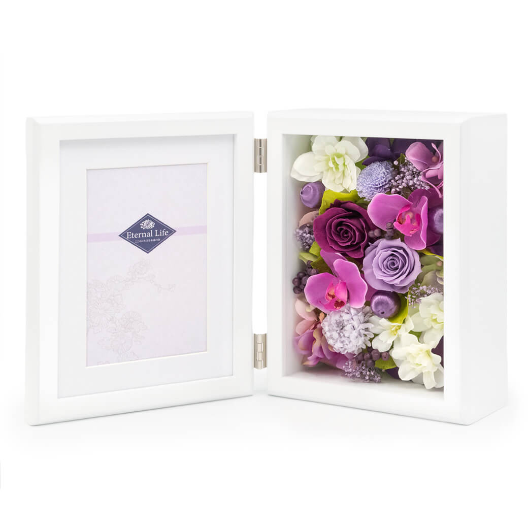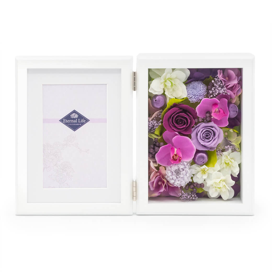 清らかな白のフォトフレームに、紫系のプリザーブドフラワーをアレンジしたお供えフラワーギフトです。深みのある2輪のバラに、胡蝶蘭や小花のアーティフィシャルフラワーを丁寧に添えて、上品な印象に仕上げています。