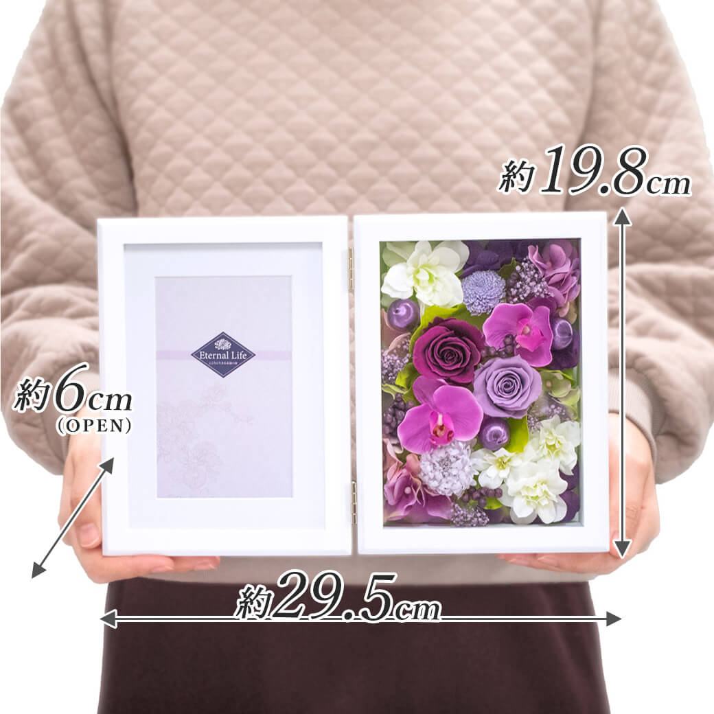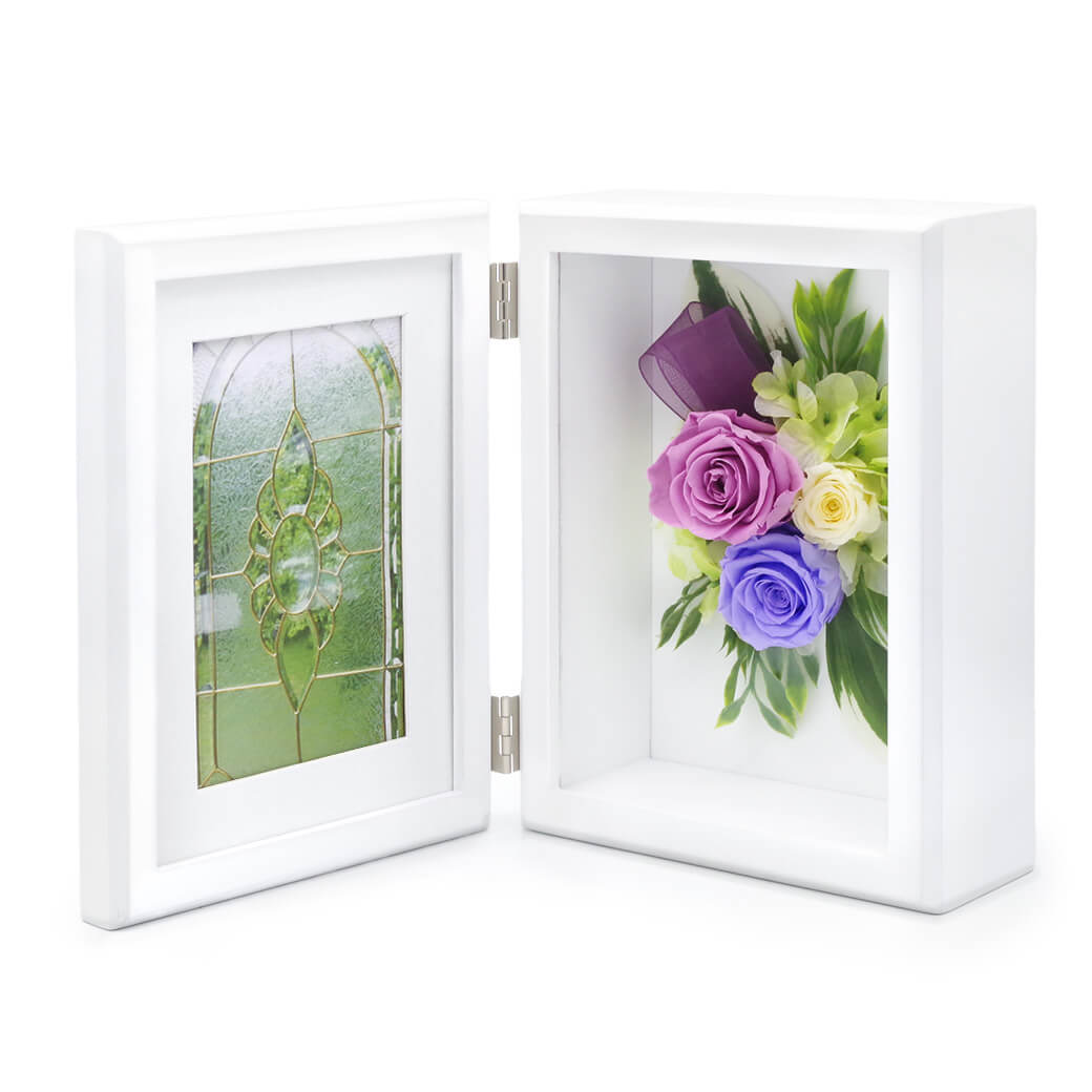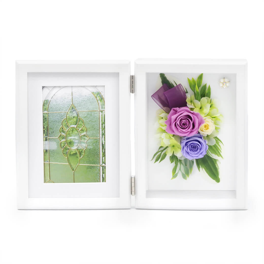 もう片面は写真立てとして使えるフォトフレーム仕様で、故人の思い出の写真や大切な一枚を飾ることができます。枯れない加工を施しているため、水やり不要で長期間美しさを保てるのも大きな魅力。洋風のお仏壇やリビングにも馴染みやすく、日常の中でやさしく故人を偲ぶことができます。