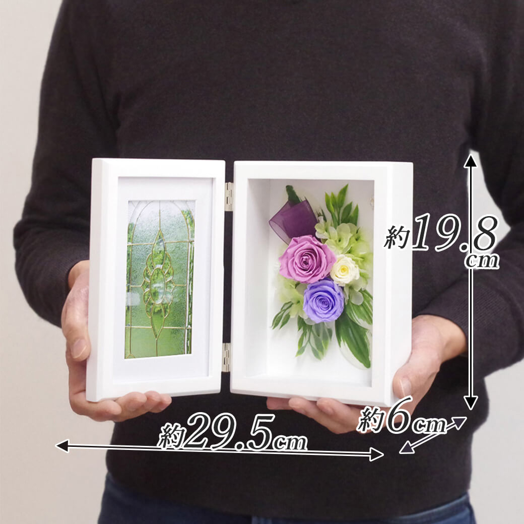 フレームの両側にはガラスが付いており、ホコリや汚れの心配もありません。プリザーブドフラワーの供花を探している方や、命日・法要・新盆・お彼岸などにふさわしい贈り物をお探しの方に最適です。