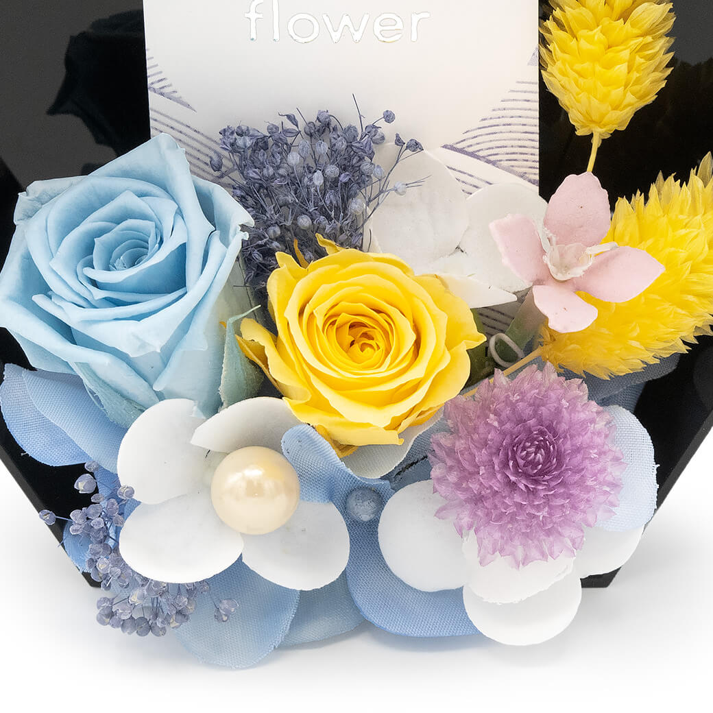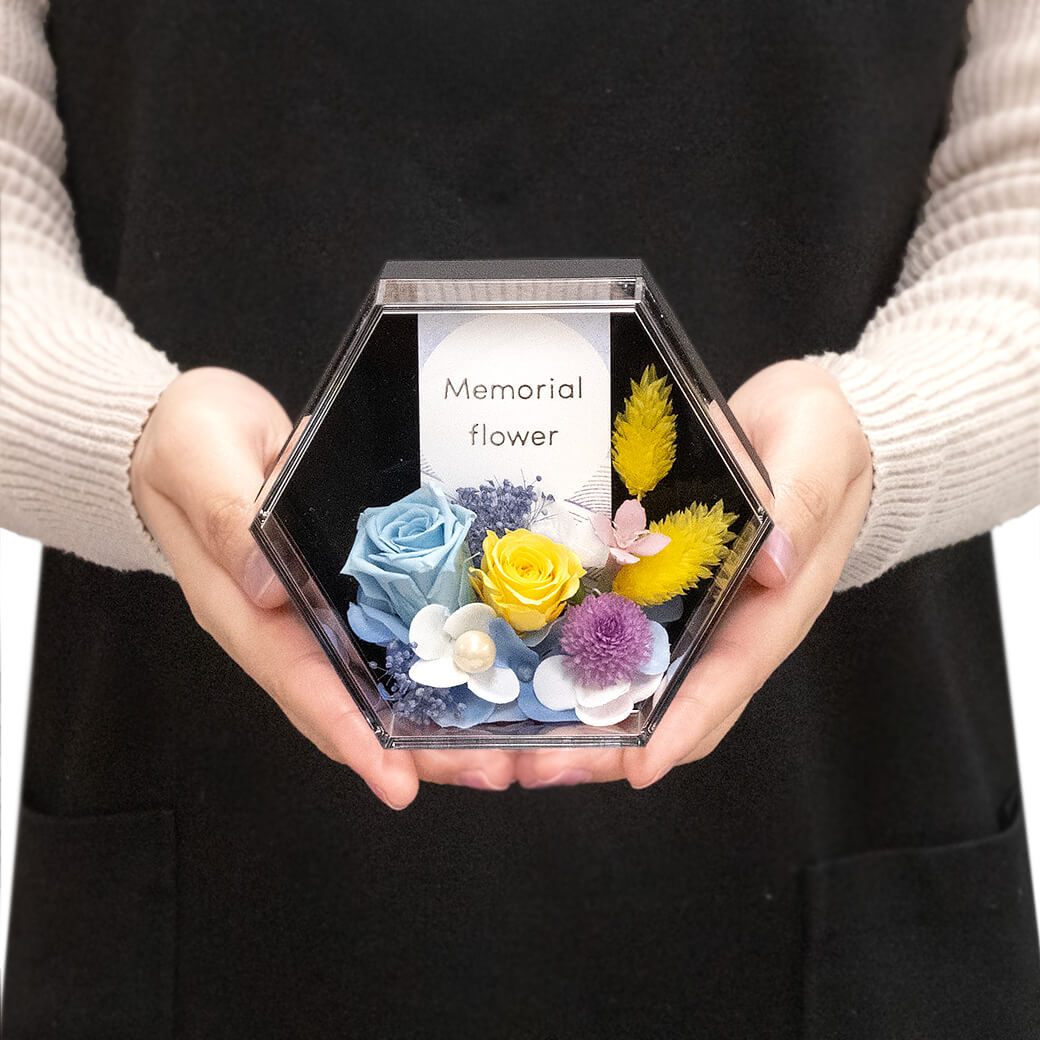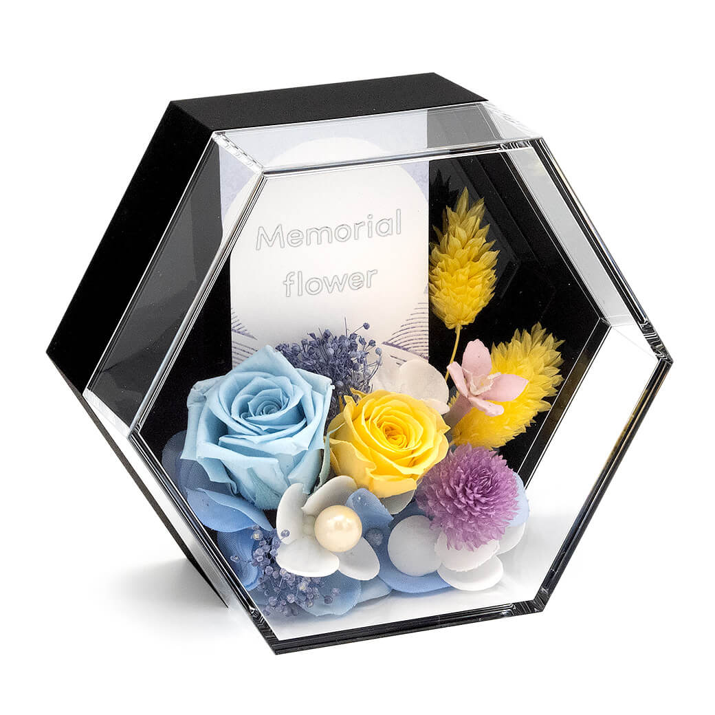 透明感あふれる六角形のケースにプリザーブドフラワーを美しく仕立てた、お供え用フラワーギフトです。優しい黄色のバラと、清らかな水色のバラを中心にアレンジ。花の色彩を引き立てながらも主張しすぎず、仏壇まわりや静かな空間に自然となじみます。