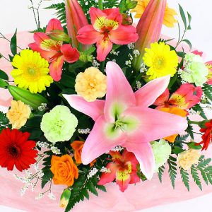 ユリと季節の花材を取り合わせたアレンジ