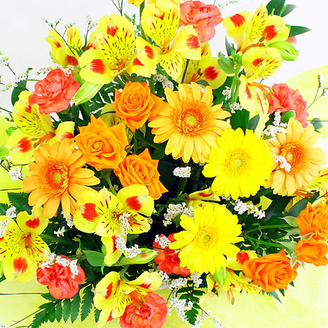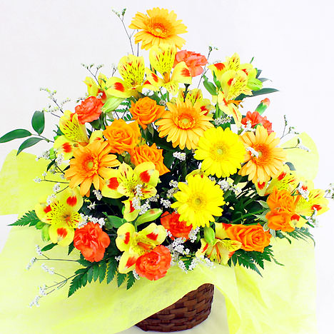 元気いっぱいのビタミンカラーをメインに、季節の花々をバランスよく取り合わせた華やかなフラワーアレンジメントです。誕生日、開店祝い、就任祝いやご退職、ご退院祝いなど、さまざまなシーンで贈る方の祝福の気持ちを鮮やかに表現します。この暖色系アレンジメントは、受け取られる方を明るく元気な気持ちにさせてくれるような素敵なギフトになるでしょう。