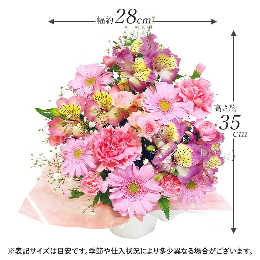 柔らかな色合いのピンク系の季節の花々をメインに使用し、華やかでありながら心温まるアレンジに仕上げました。特別な日を華やかに演出するアレンジメントフラワーは、女性の方やピンク色がお好きな方にはもちろん、お誕生日や記念日、お見舞いなど、どのようなシーンでも心に残る贈り物として喜ばれます。