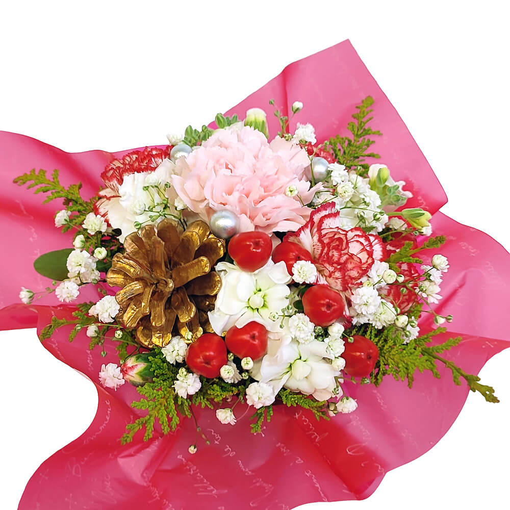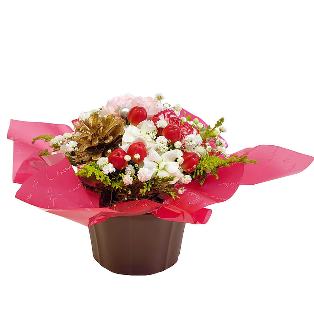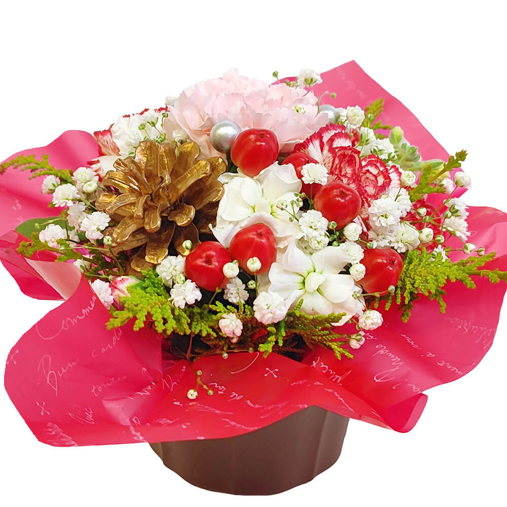 クリスマスシーズン限定のフラワーアレンジメントです。かわいらしい赤と白の花々に、ゴールドの松ぼっくりが季節感アップ♪クリスマスのテーブルやパーティを華やかに演出します。テーブルフラワーやクリスマスの飾りとしてはもちろん、12月のお誕生日ギフトや結婚祝いなどのお祝い事にもオススメです☆