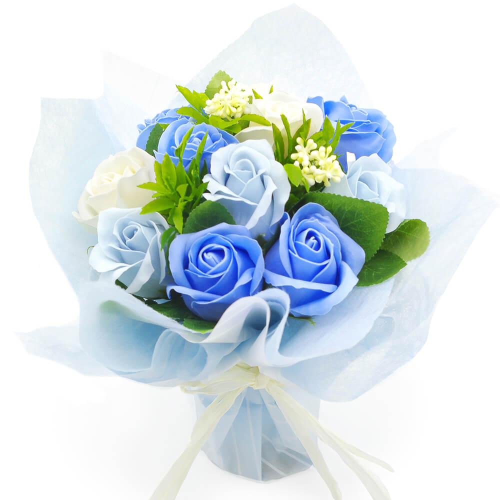 ブルー系とホワイトのバラに、グリーンがアクセントになった爽やかでエレガントな花束です。