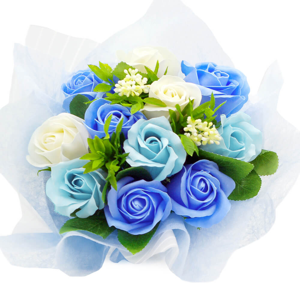 ブルー系とホワイトのバラにグリーンがアクセントになった爽やかでエレガントな花束。