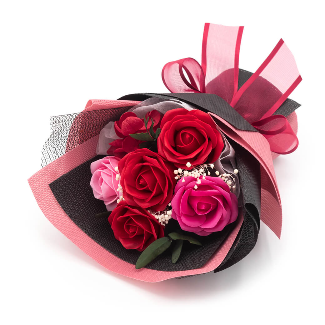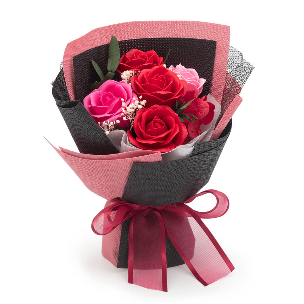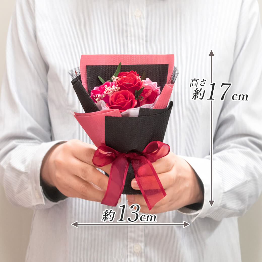 ほのかにシャボンのアロマが香る、石鹸素材でできたソープフラワーのミニブーケです。華やかな赤いバラをメインに、洗練された黒基調のラッピングが高級感のあるアレンジ。