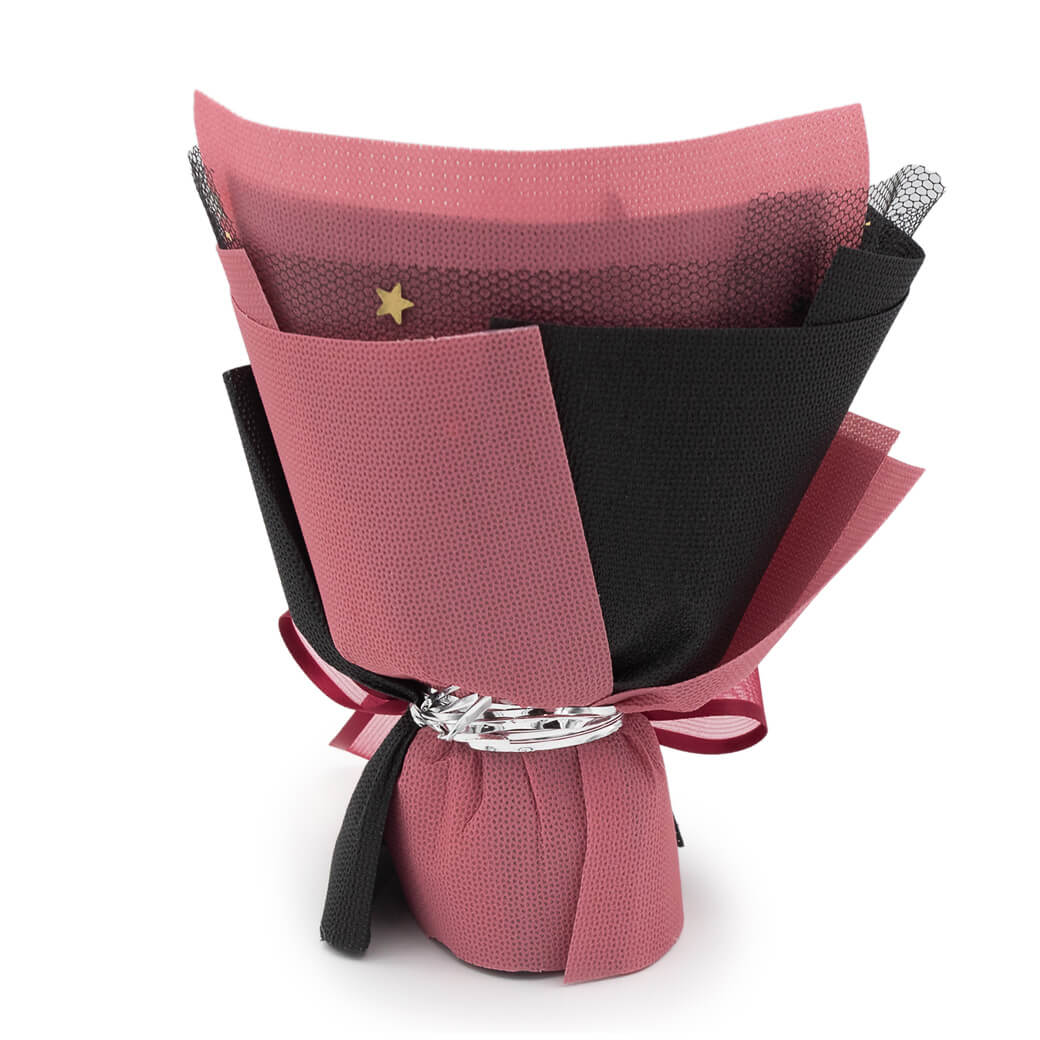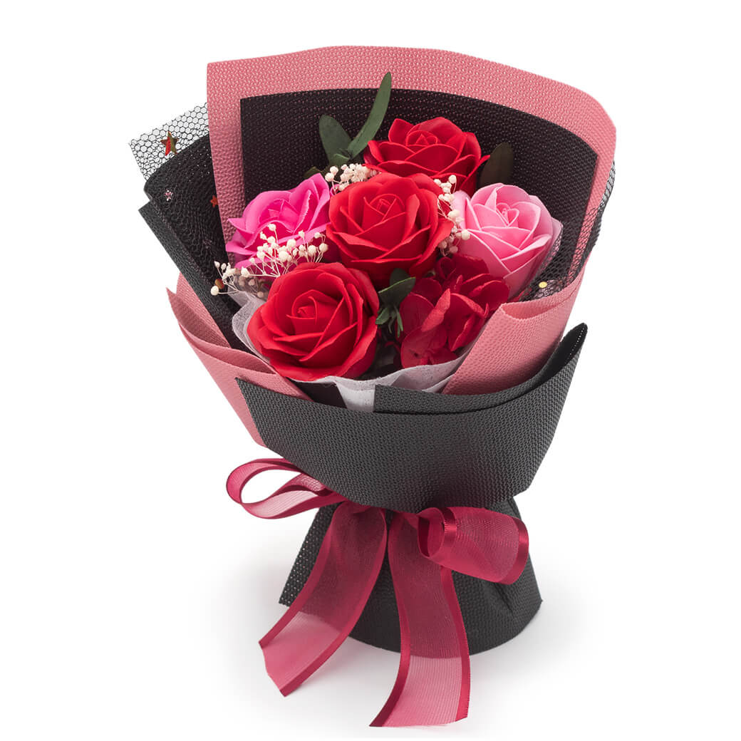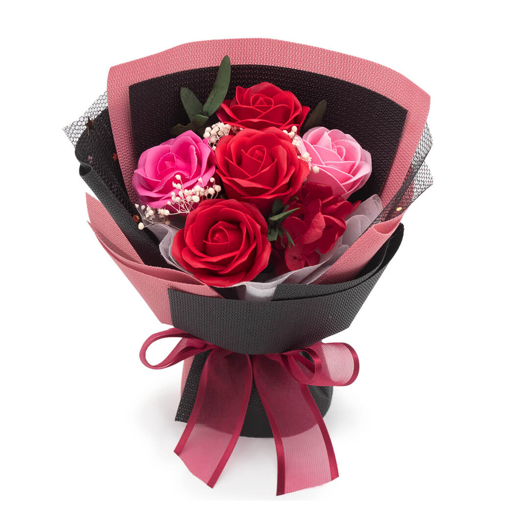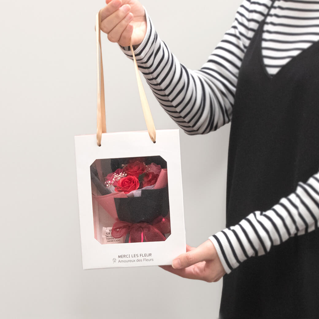 ほのかにシャボンのアロマが香る、石鹸素材でできたソープフラワーのミニブーケです。華やかな赤いバラをメインに、洗練された黒基調のラッピングが高級感のあるアレンジ。