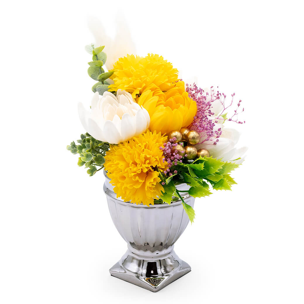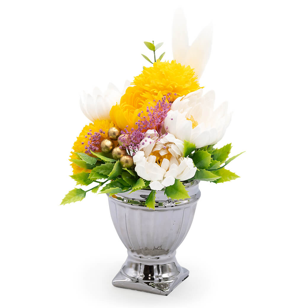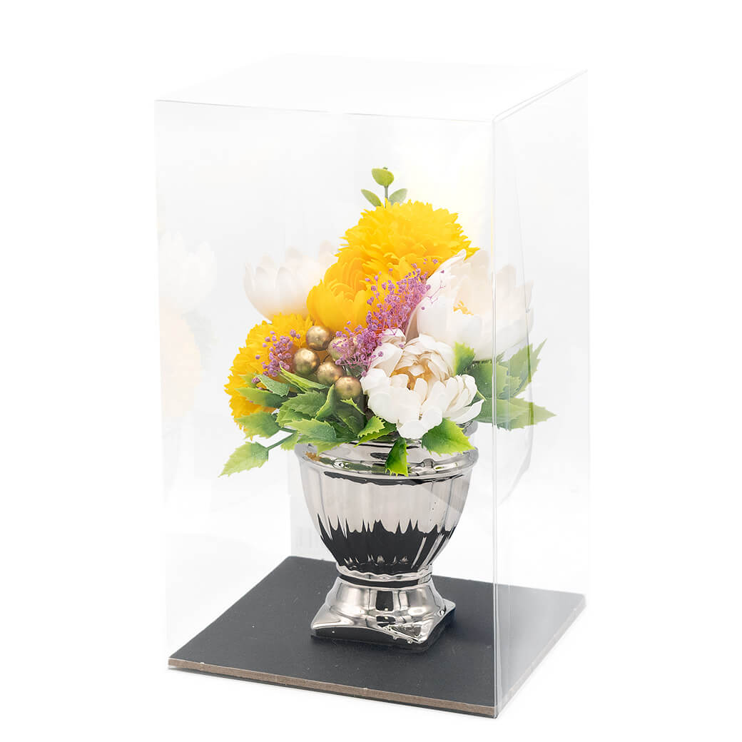 丸みを帯びたシルバーのポットが、あたたかみの中にも凛とした印象を添える、上品なお供え用アレンジ。大切な方への静かな祈りを込めたお供えや、故人を偲ぶ場にふさわしいフラワーギフトです。石けん素材でつくられたソープフラワーは枯れることがなく、お手入れの手間もかかりません。お悔やみごとや年忌法要のお供えとして、お仏壇や法要の場を穏やかに彩ります。