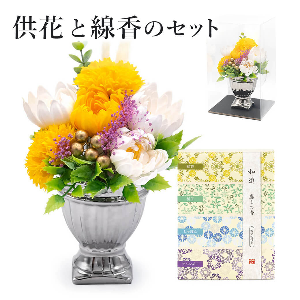 お供え花にお線香を添えた、心配りの感じられるお供えセットです。香りと彩り、大切な方を想う心をそっと届けます。