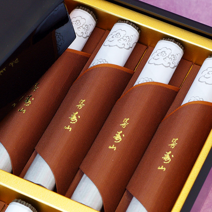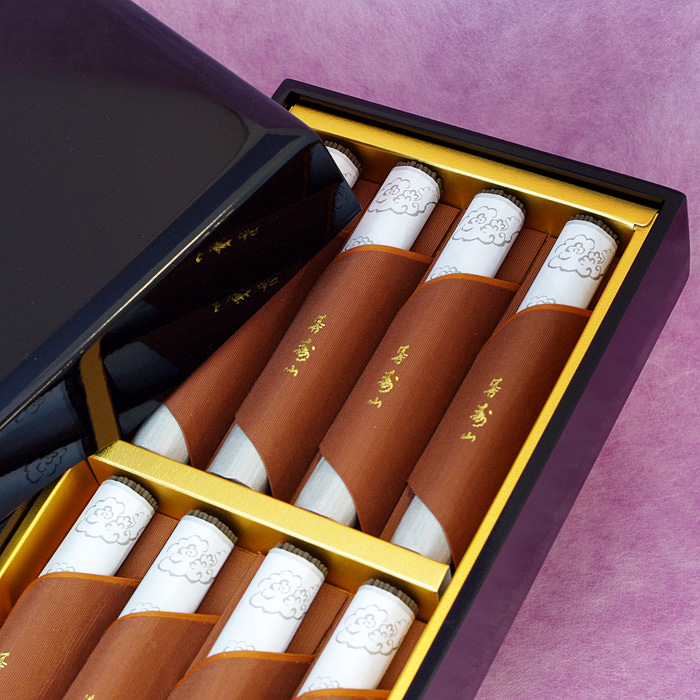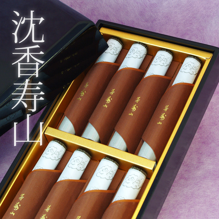 香木として貴重な沈香を用いた、味わい深い香りの「沈香寿山」を本塗箱に納めた高級品です。
