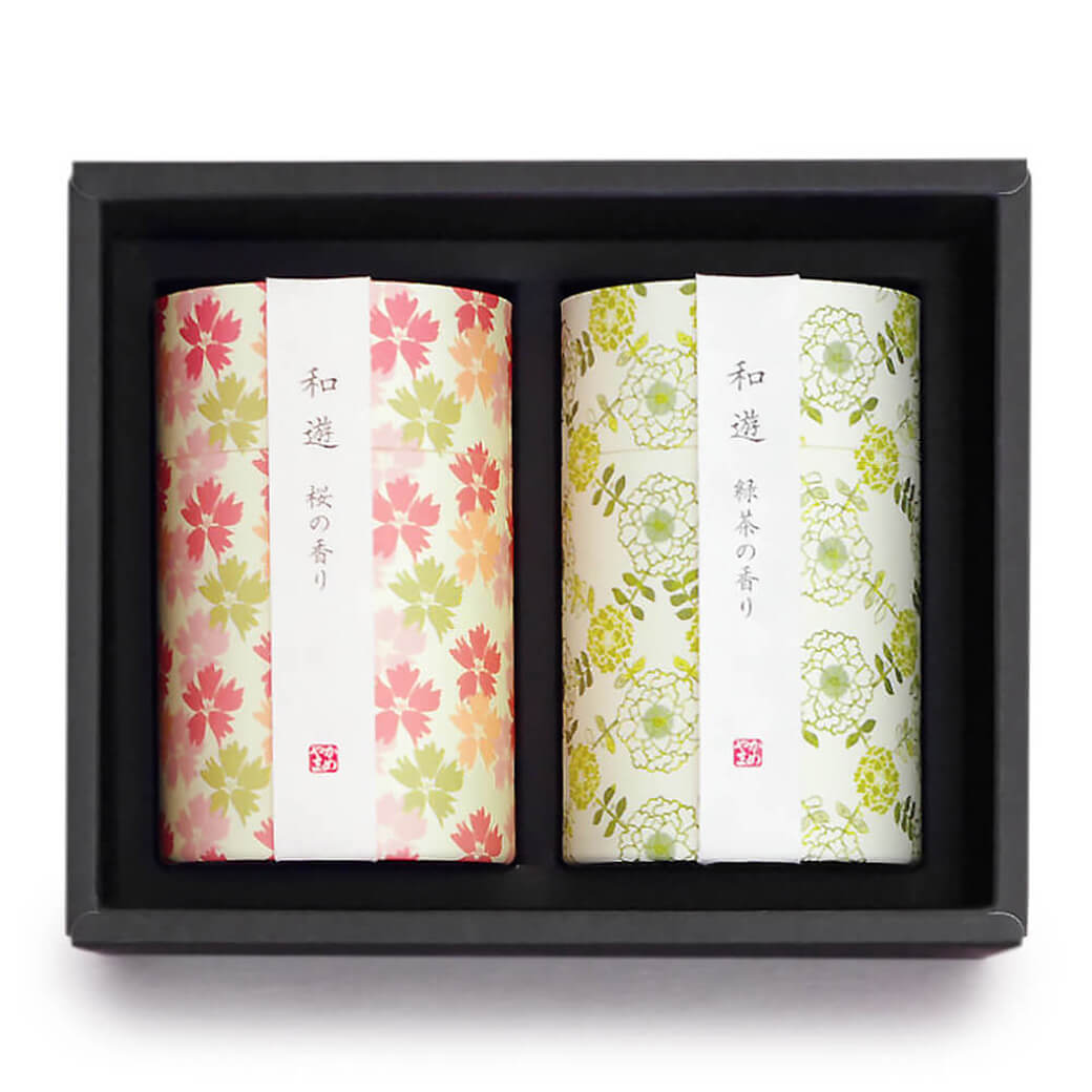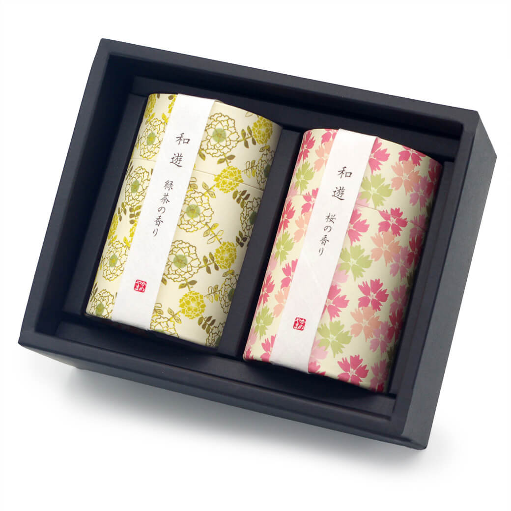 デザイン性の高い和モダン柄の筒箱が特徴の和遊シリーズを、贈答用・進物用としてもお使いいただきやすいようギフトボックス入りのセットにしました。