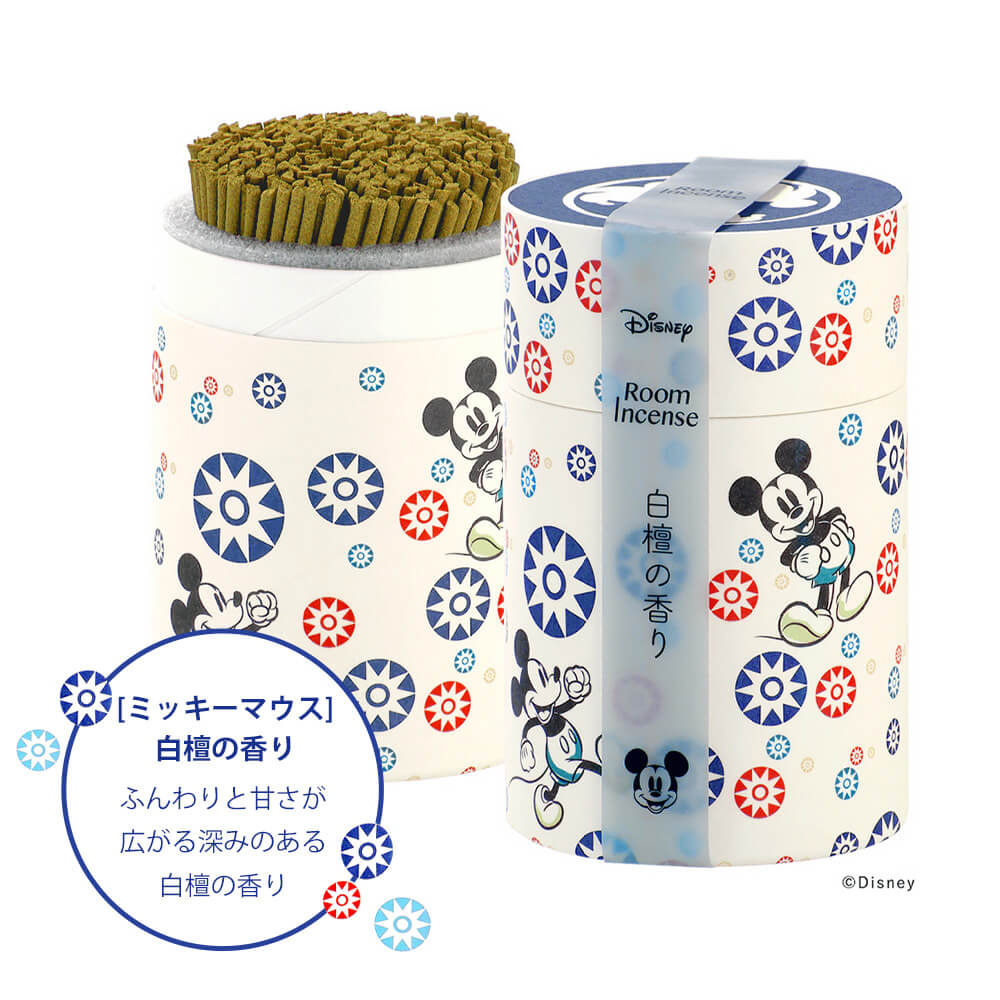 ディズニーの人気キャラクターをイメージしたルームインセンスのギフト。ミッキーマウスは、ふんわりと甘さが広がる深みのある「白檀の香り」。ミニーマウスは、フローラルにグリーンノートを少しきかせた華やかな「すみれの香り」。キャラクターをイメージして調香しています。香皿とミッキーデザインのインセンスホルダー付きで、使うたびにディズニー気分になれます。お盆やお彼岸、命日などの年忌法要にお贈り頂けます。
