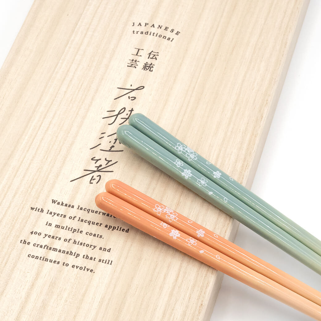 和の雰囲気が可愛いらしい、日本の伝統を感じられる夫婦箸ギフトセットです。淡い色合いのお箸には桜のモチーフがあしらわれ、食卓に華やかさを添えます。箸先には滑り止め加工が施されており、麺類もしっかりつかめる実用性と、食洗機対応の便利さを兼ね備えています。