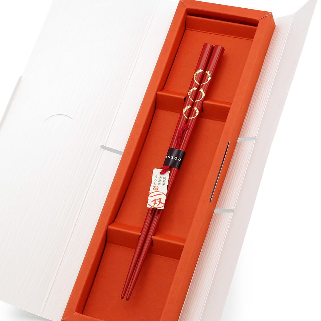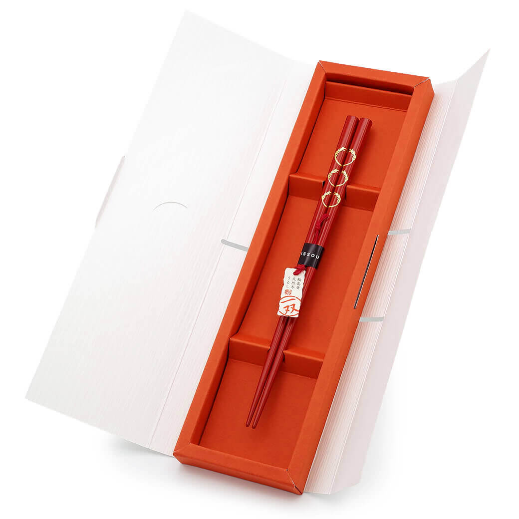 お箸の木質の縁起と、図柄に込められた物語に思いを込めた祝い箸である「めでた箸」。贈り物にふさわしい、のし袋風のおしゃれで華やかな専用パッケージと、心温まるしおりをセットにしてお手元へお届けします。
