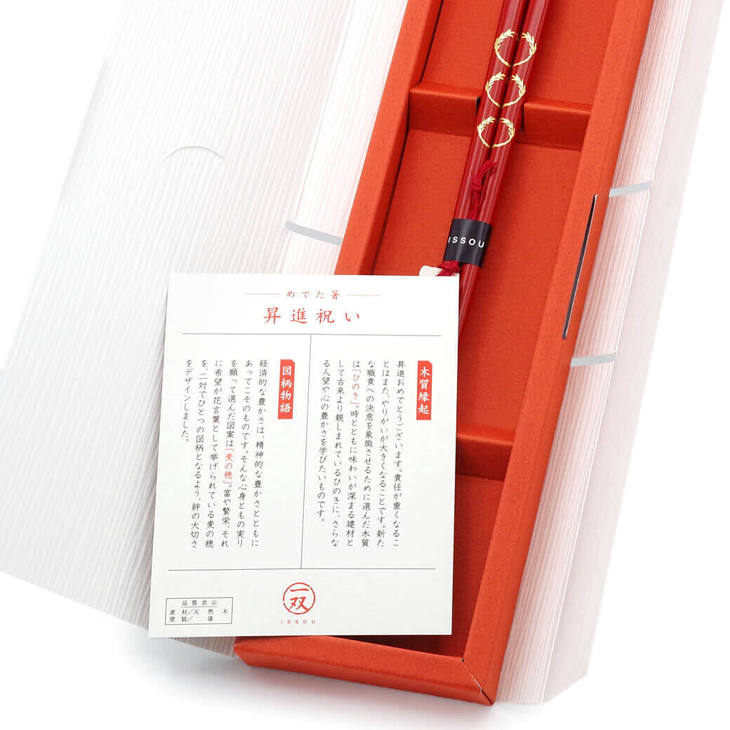 新たな挑戦への門出を祝して、縁起の良い「麦の穂」をデザインした朱赤漆塗りのお箸です。麦の穂は「富」や「繁栄」、そして「希望」を象徴し、金色で描かれたその輝きは、未来への祝福を表現しています。また、木質には古来より建材として親しまれる「ひのき」を採用。時を経るごとに風合いが増すこの素材には、責任を担いながらも人望や心の豊かさを育む願いが込められています。昇進祝い・就任祝い・栄転祝いなどビジネスのお祝いの贈り物として、日々の食卓に彩りと幸福を届ける特別な一膳です。