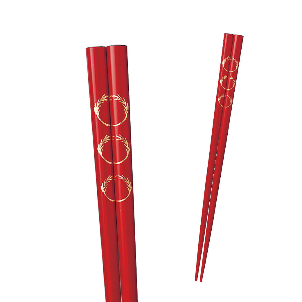 • 漆塗りの艶やかな赤と黒に、縁起の良い「麦の穂」を金色で描いた夫婦箸のセットです。