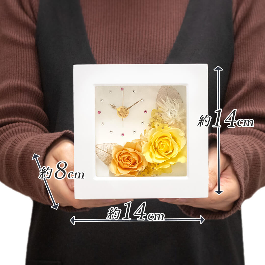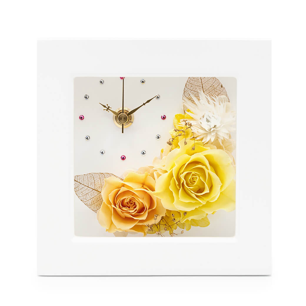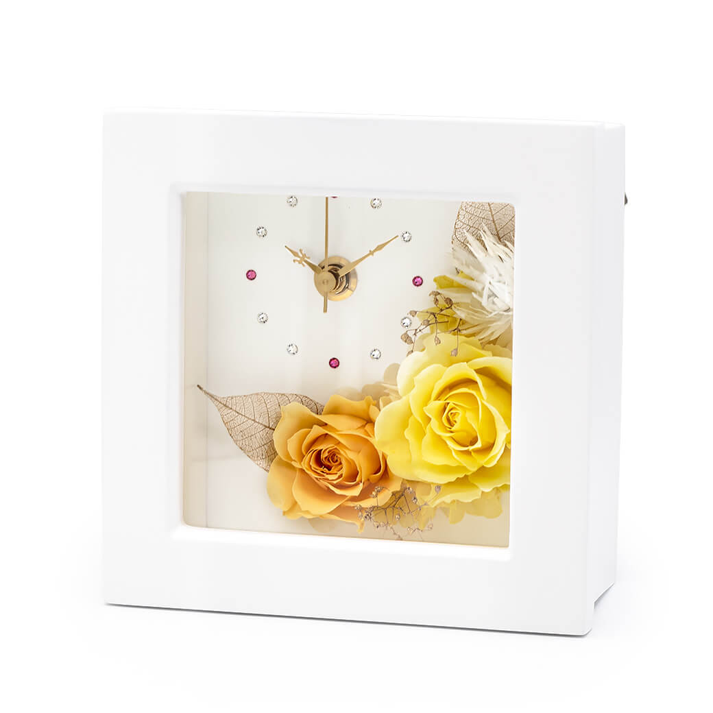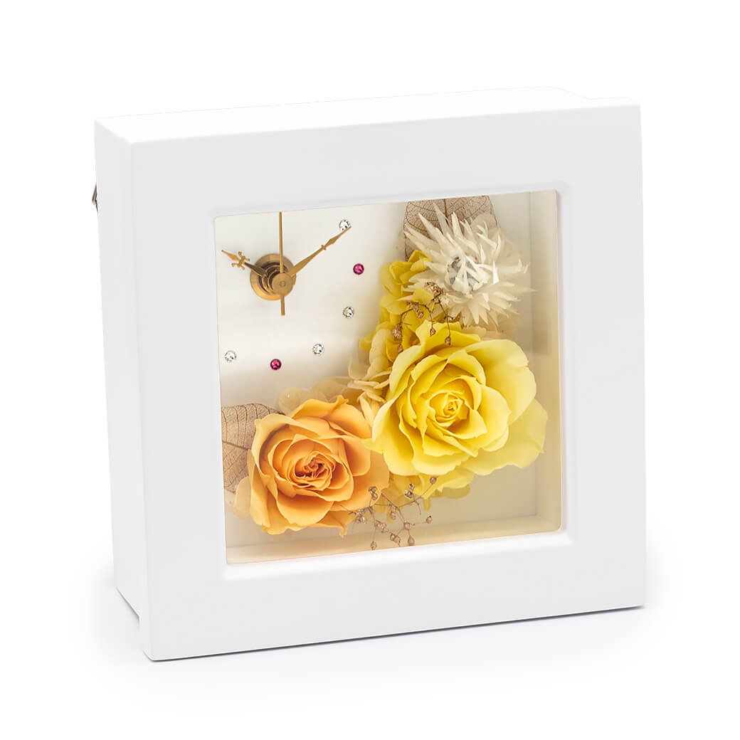 プリザーブドフラワーと時計が一体になった、実用性とおしゃれさを兼ね備えたフラワー置時計です。白いフレームの中央にプリザーブドフラワーのバラと、ゴールドのカスミソウやリーフを上品にアレンジ。温かな黄色とオレンジのローズは、お部屋をパッと明るく演出し、前向きな気持ちにしてくれるカラーです。