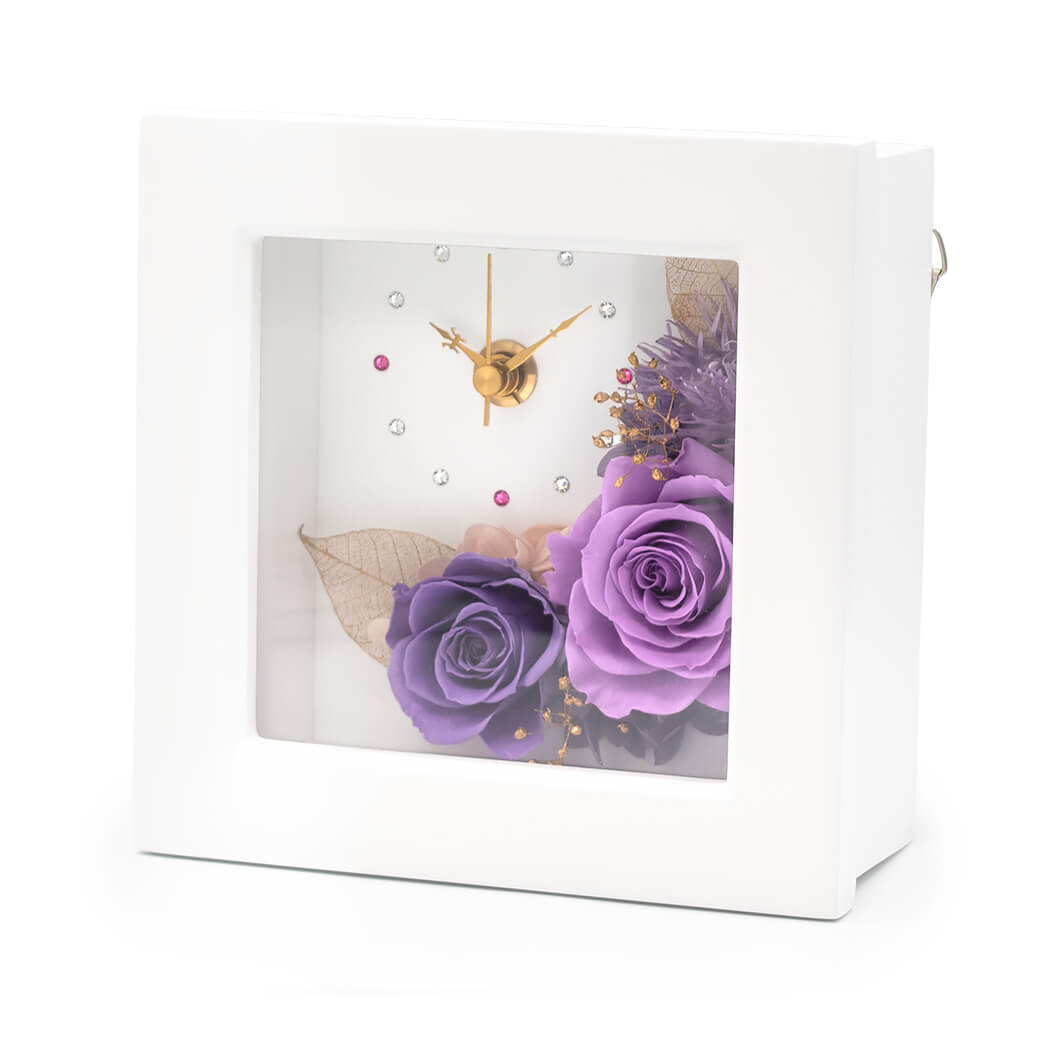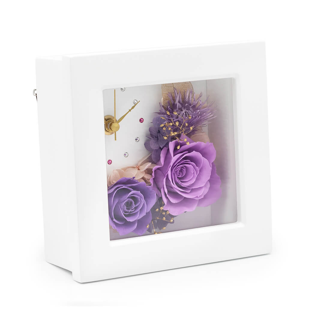 プリザーブドフラワーと時計が一体になった、実用性とおしゃれさを兼ね備えたフラワー置時計です。白いフレームの中央にプリザーブドフラワーのバラと、ゴールドのカスミソウやリーフを上品にアレンジ。落ち着いた紫色のローズは、シックで洗練された印象で、男女問わず贈りやすい大人カラーです。