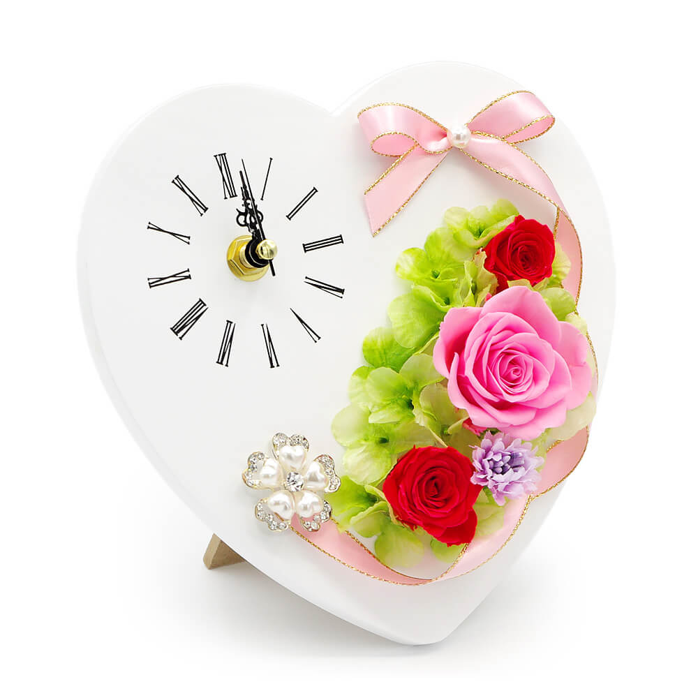 時計付きのハート型フレームに、ピンクと赤のバラを華やかにアレンジしたおしゃれなクロックフレーム。