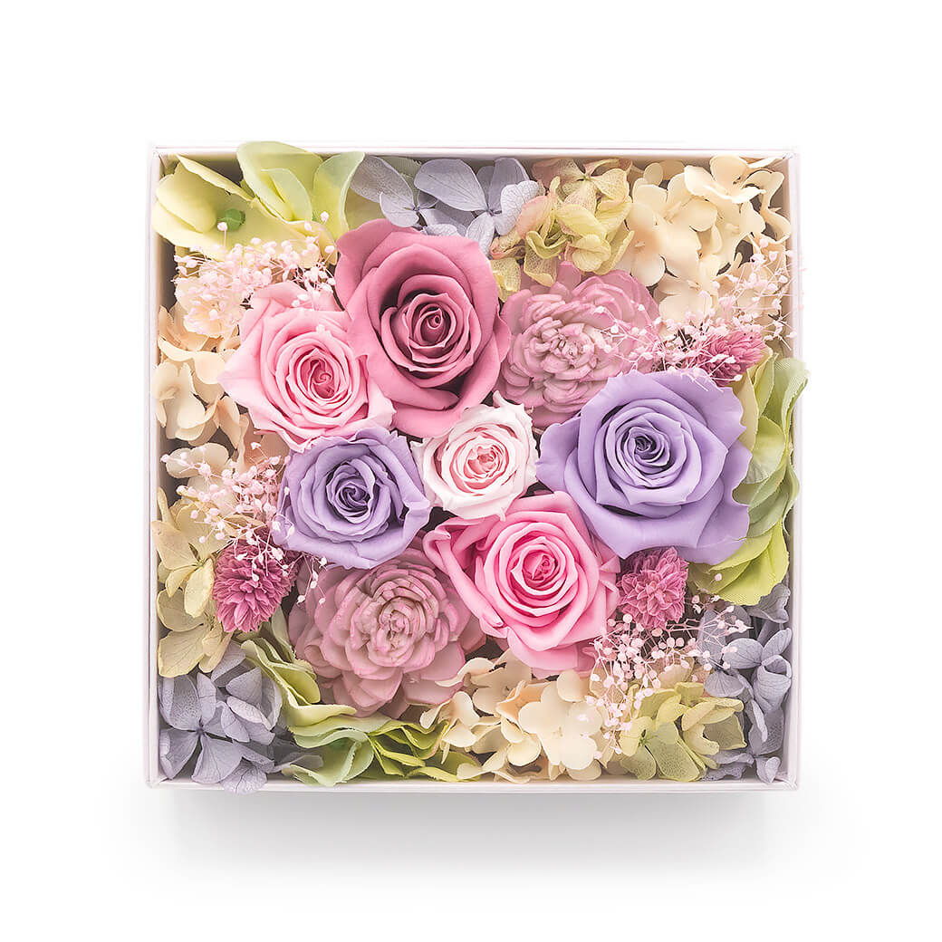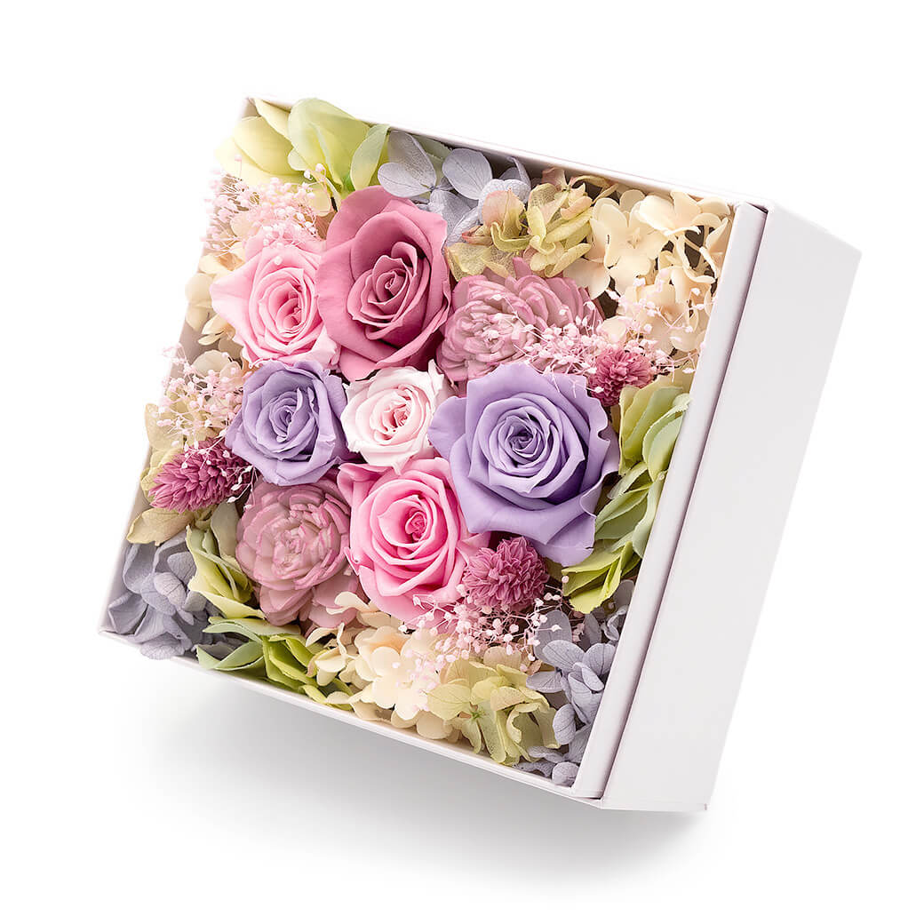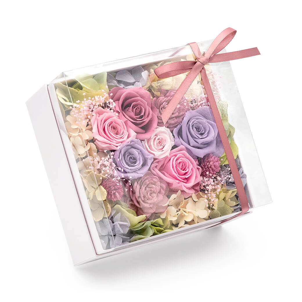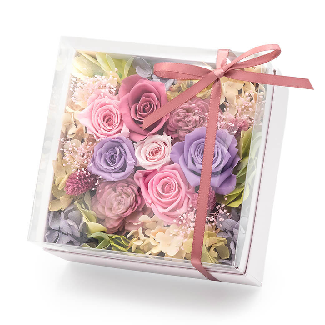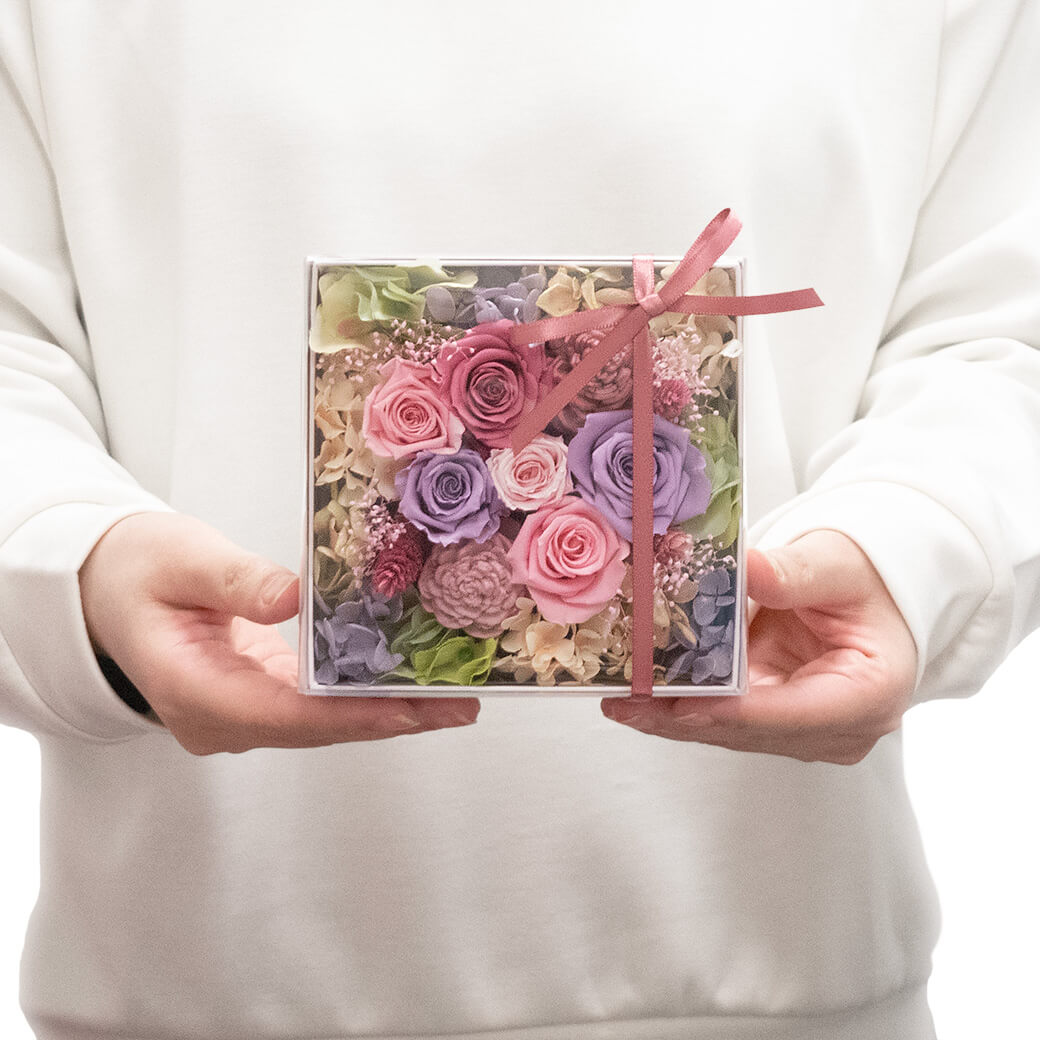 リボンをかけたおしゃれなボックスに、枯れないお花「プリザーブドフラワー」のバラをぎゅっと詰めこんだ、ボックスフラワーのギフトです。