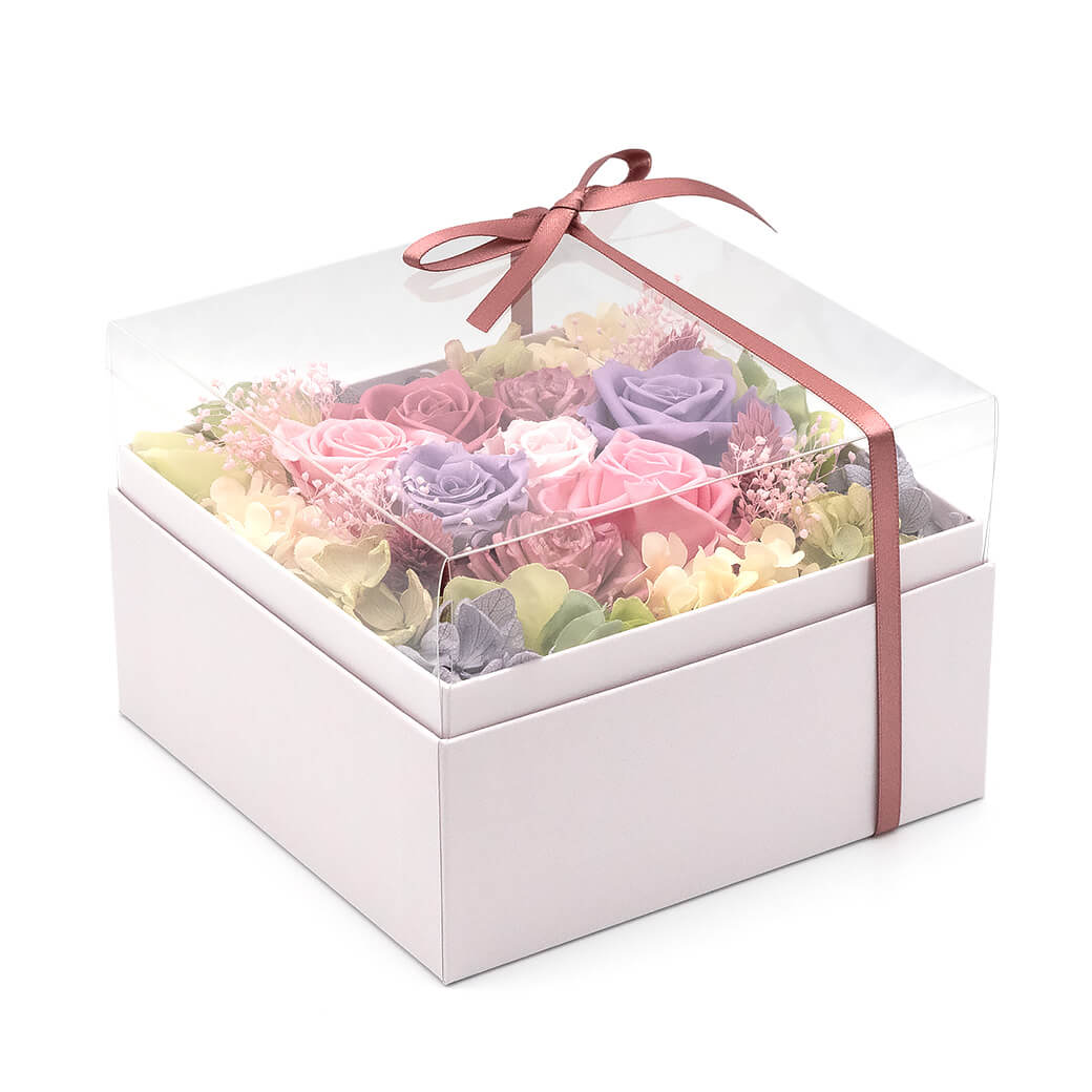 くすみカラーのバラとニュアンスカラーが大人可愛い上品なアレンジ。クリアカバー付きのボックスは、中のバラが正面や側面からも見える立体的なデザインで、お部屋を彩るインテリアとしてもおすすめです。結婚式や母の日、古希・喜寿などの長寿祝い、誕生日など大切な方へのお祝いにぴったりのフラワーギフトです。おしゃれなくすみピンクのアレンジは特に女性へのギフトに人気です。