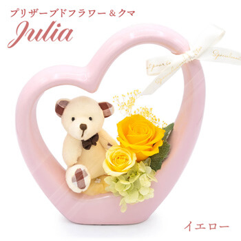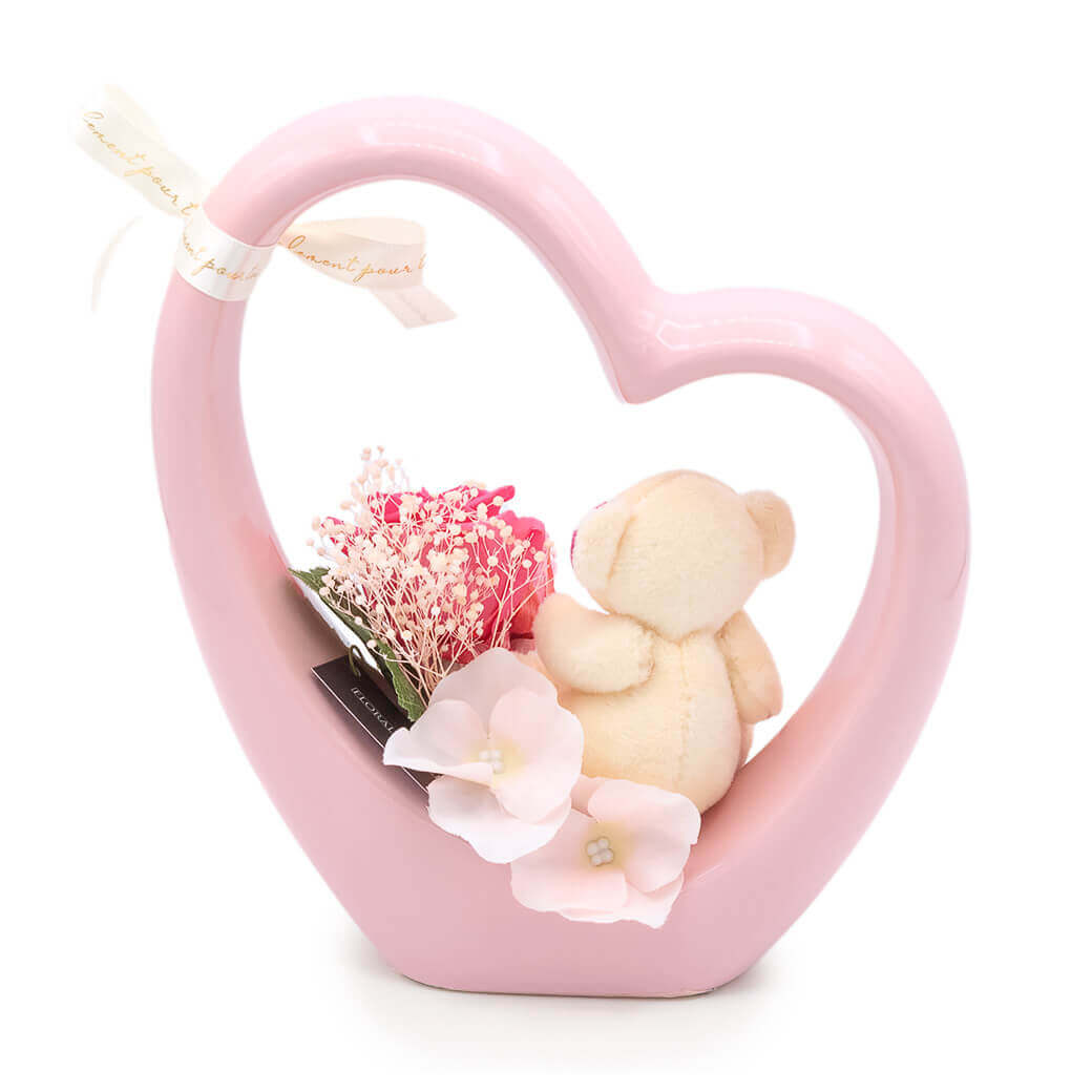 • クマとプリザーブドフラワーがハート型の器にアレンジされた癒し系ギフトです。
