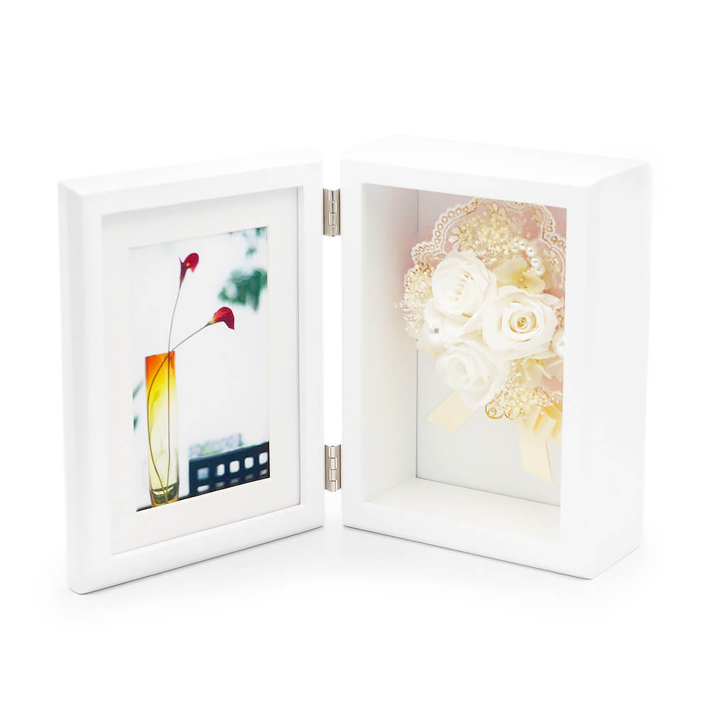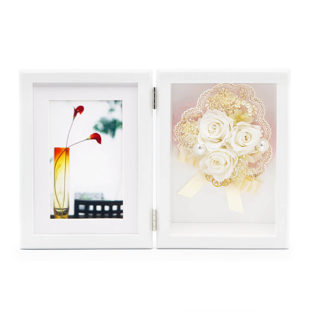 三輪の純白のバラを中心に、優しい色合いのレース・パール・ゴールドチャームなどをアレンジ。まるでウェディングブーケのような上品で清純な印象のアレンジに仕上げました。晴れ姿や記念写真を入れてフォトフレームとして飾っていただけます。フォトフレームの花と写真入れの両側にはガラスが付いており、ホコリの心配がないため、いつまでも美しい状態を保ちます。結婚式や結婚記念日、誕生日などあらゆるお祝い事を華やかに彩る贈り物となるでしょう。